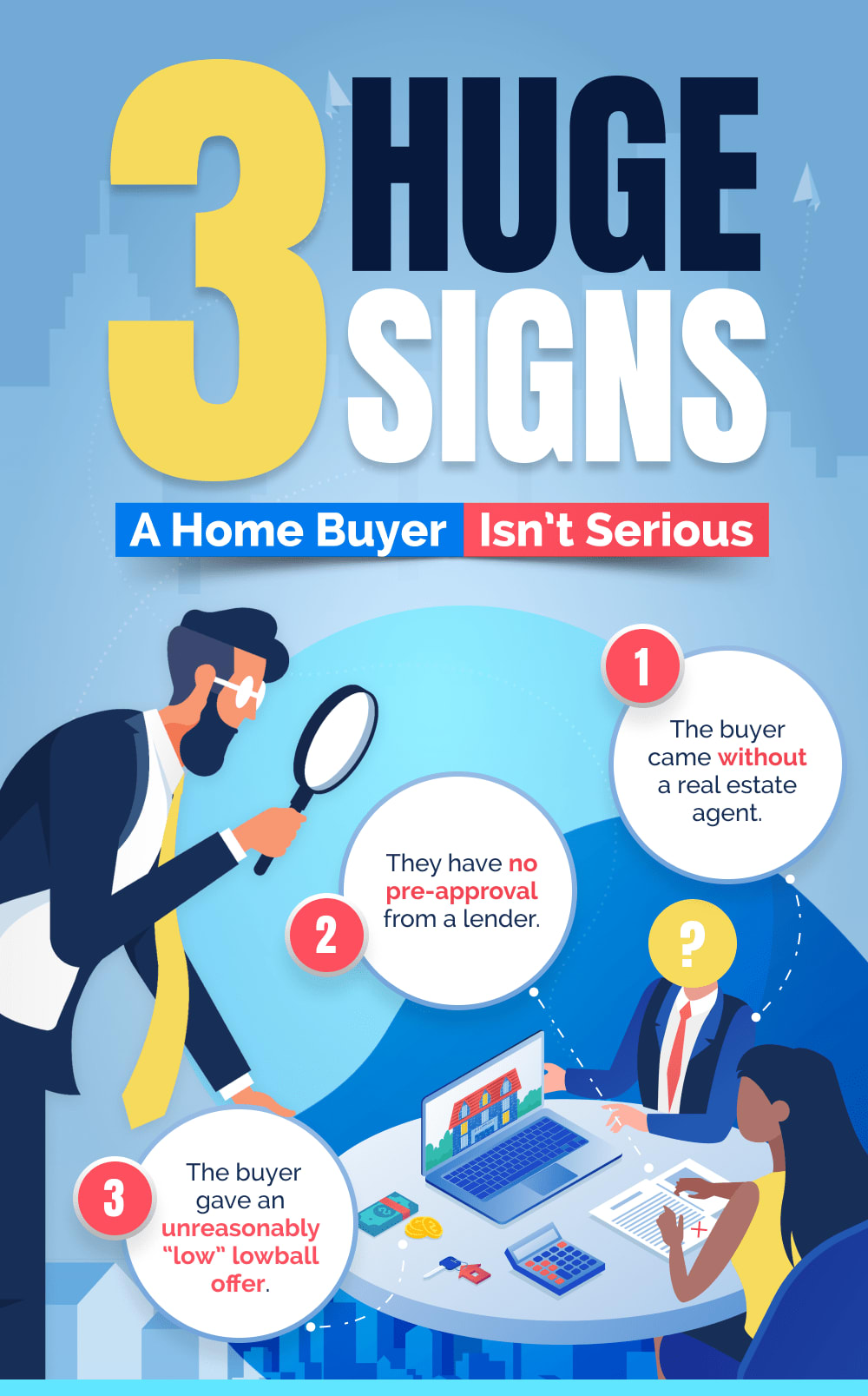 Everyone wants to get the best deal, especially if it's for an investment as huge as a home. But if a buyer submits a crazy low offer, it’s a sure sign that they don’t want the property. Serious buyers in today’s competitive real estate market will make sure to put in a legitimate offer —one that is at least close to the asking price and shows that they genuinely want to purchase the home. As a seller, it’s better not to entertain buyers with ridiculously low offers since they are probably just out there testing the waters and likely making offers to many other sellers, which means wasting time since they will not likely move forward with your property.