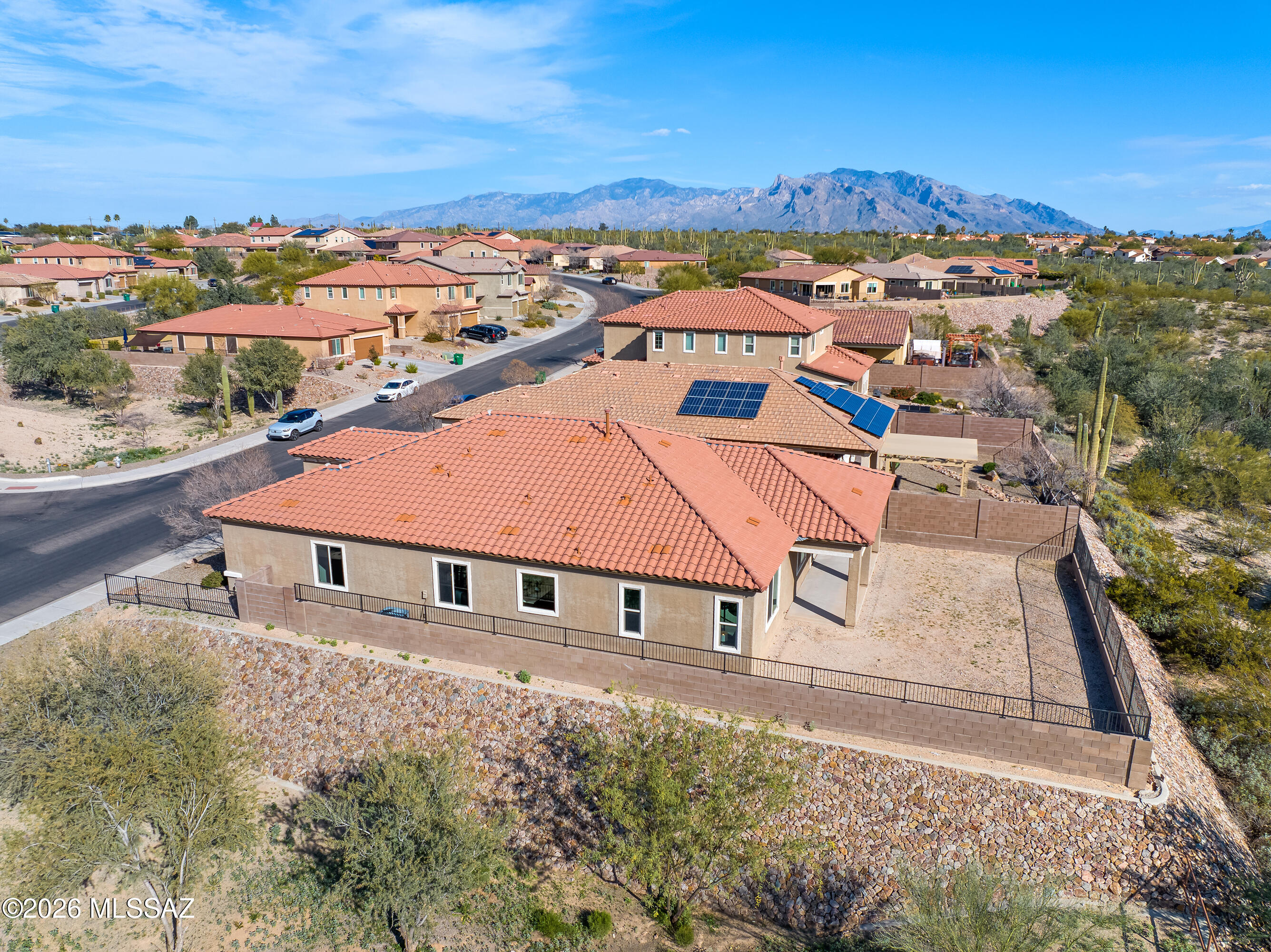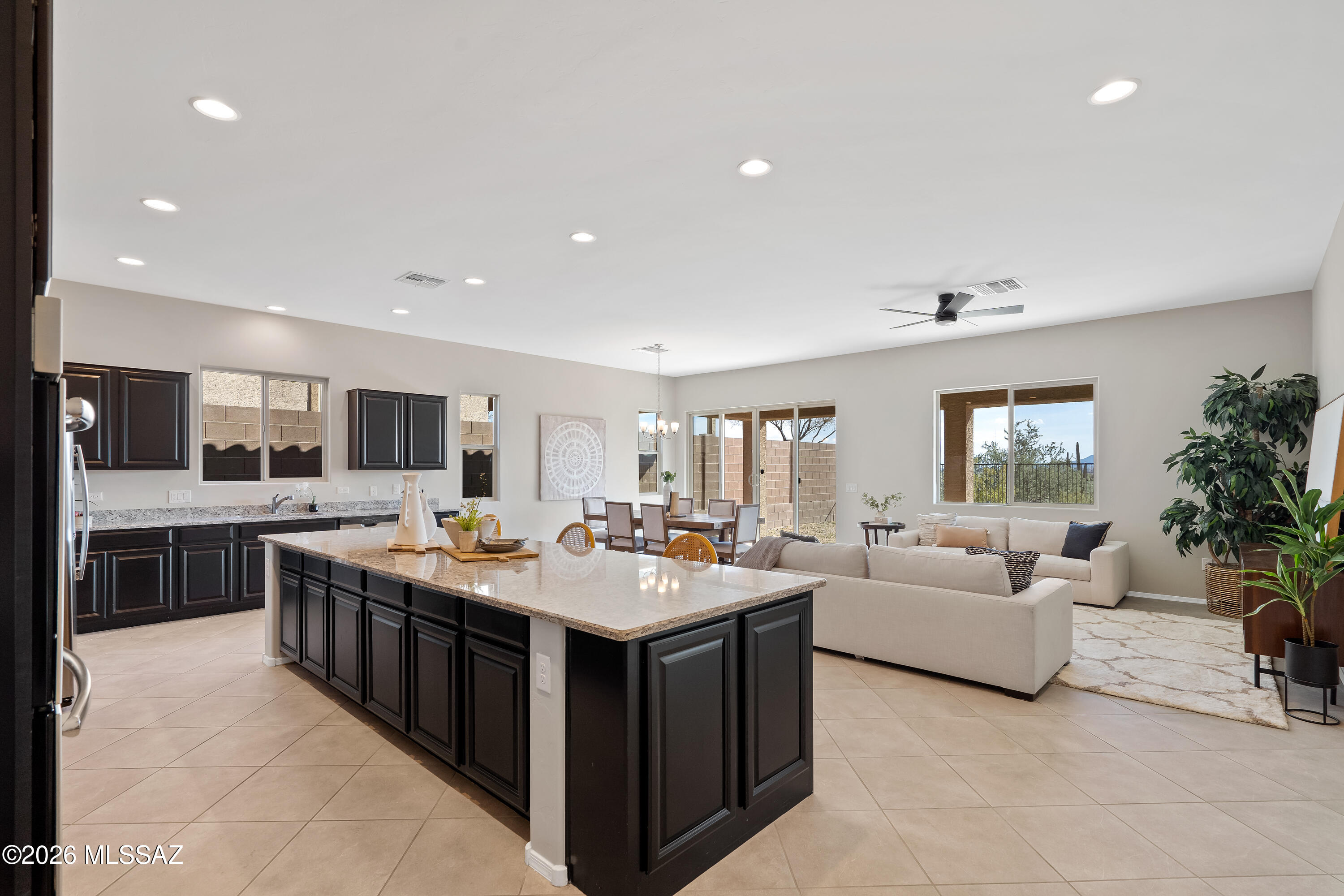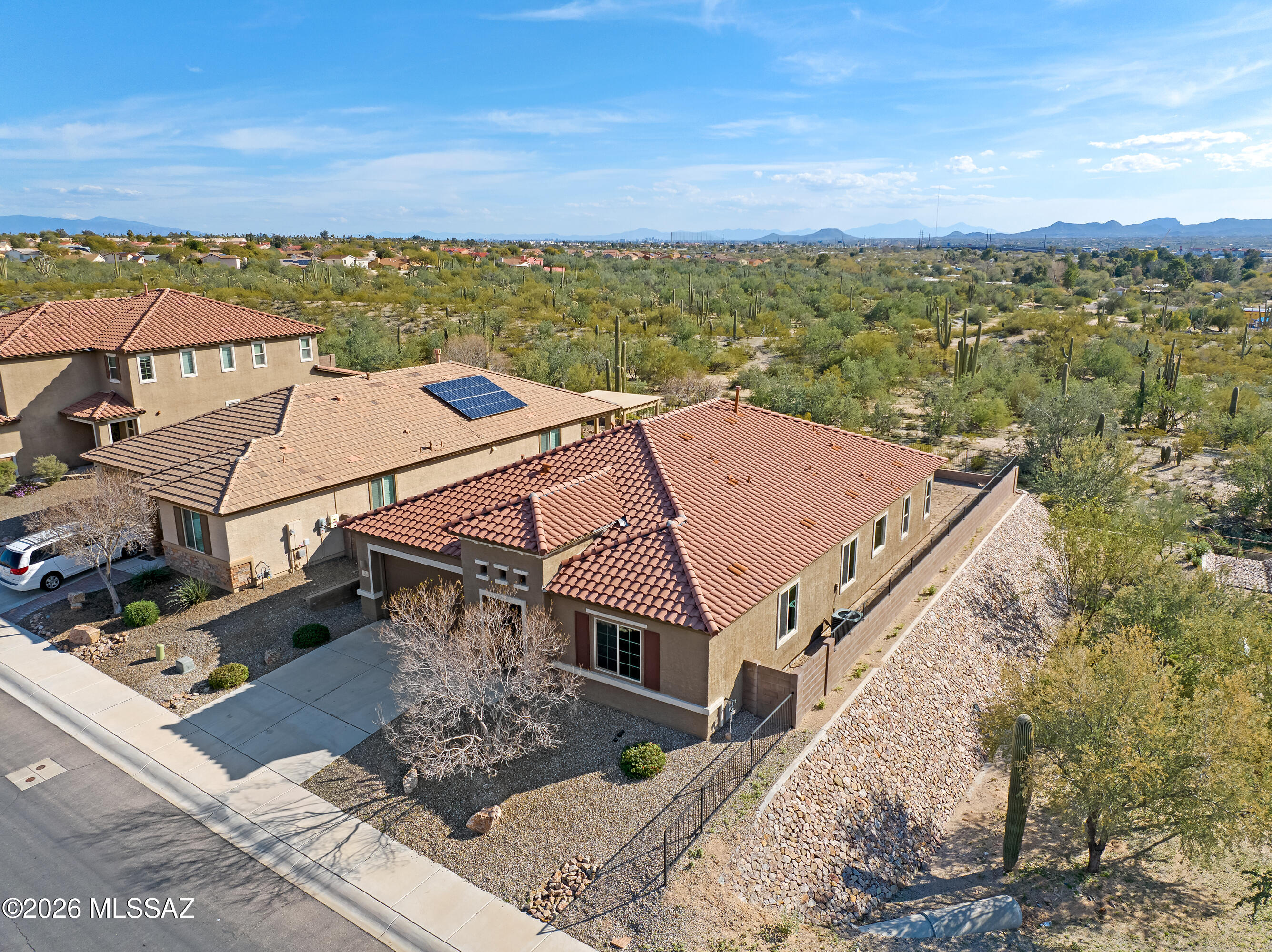 Lightly lived in by the original owners, this ranch-style Timothy plan offers a peaceful retreat with stunning mountain views and a true sense of privacy. The inviting great room flows seamlessly into a well-appointed gourmet kitchen with stainless steel appliances and one of the largest islands you'll see--ideal for both everyday living and entertaining. Three spacious bedrooms each feature generous walk-in closets, while the primary suite provides a private escape with its own luxurious bath. A large study offers flexible space for work or hobbies, and 18'' x 18'' tile enhances the main living areas. Step outside to the expansive covered patio and enjoy serene surroundings and beautiful Arizona sunsets. The Tucson mountain range in the distance is spectacular in late afternoon sun.