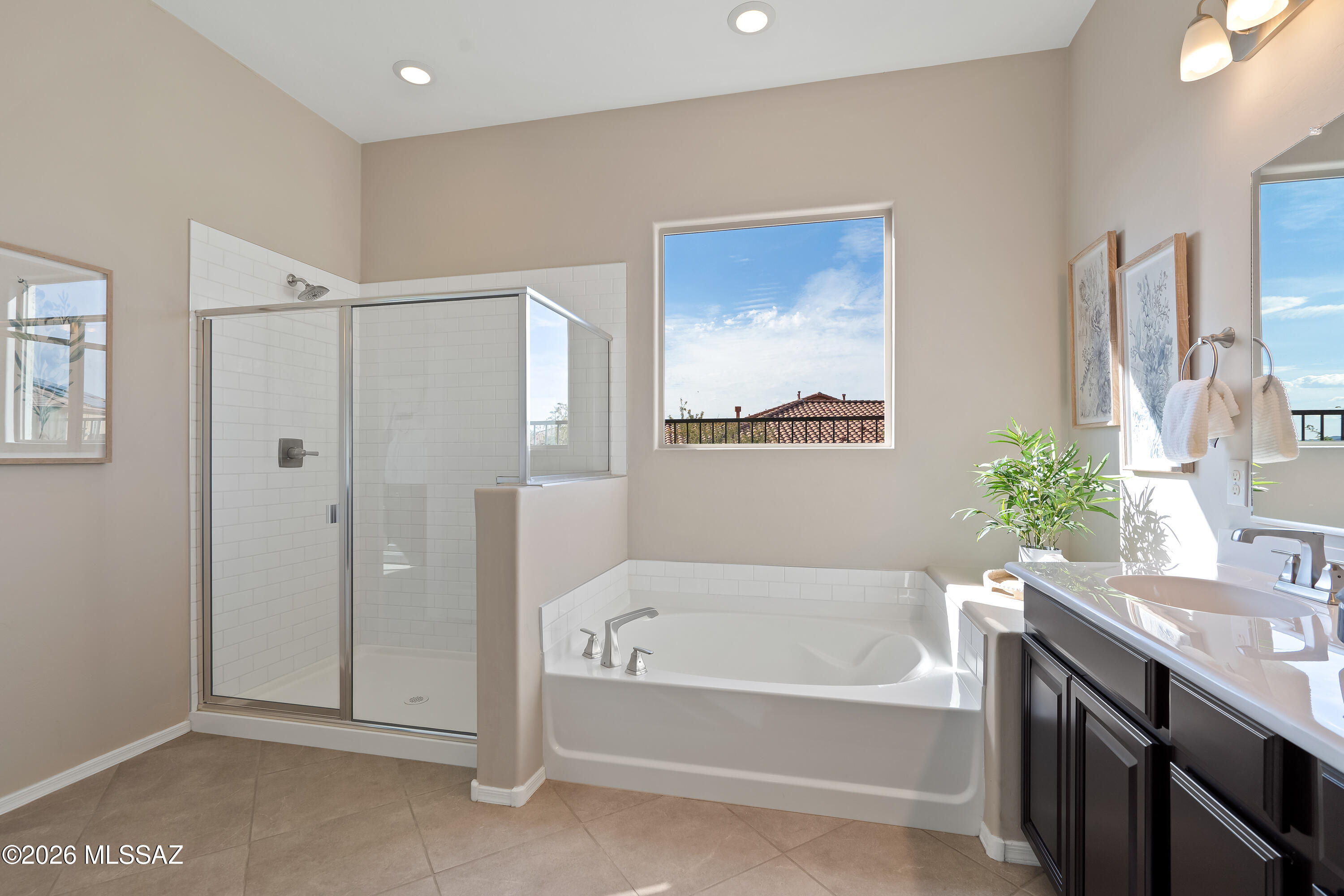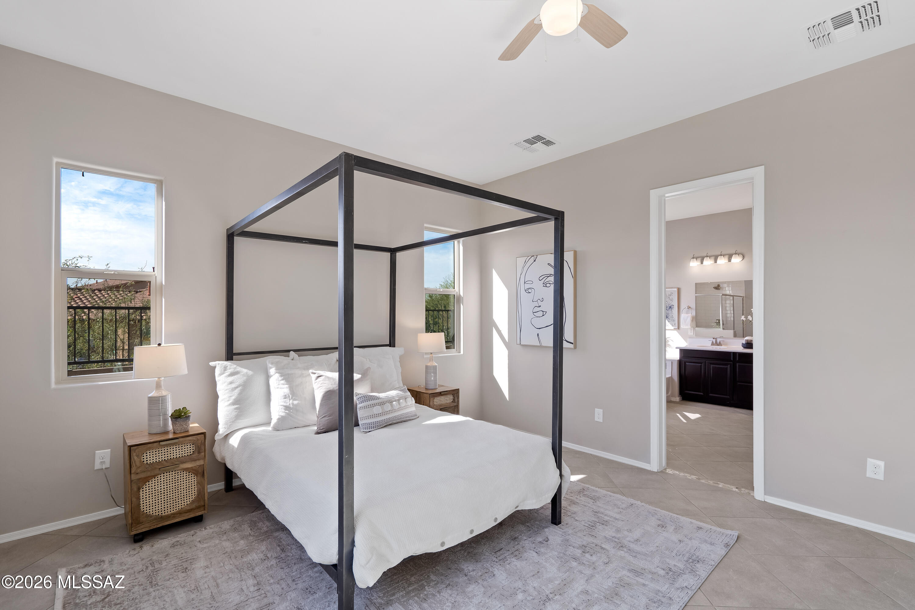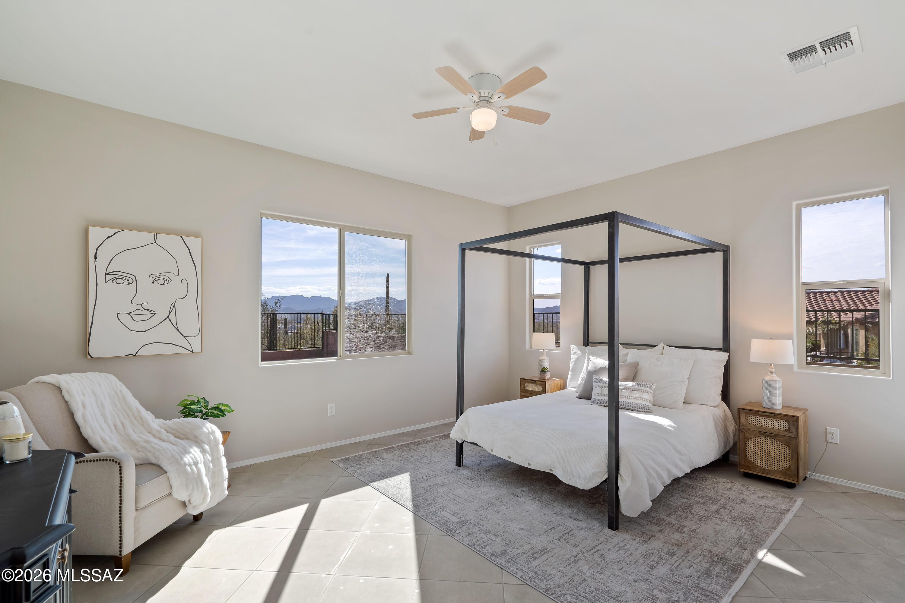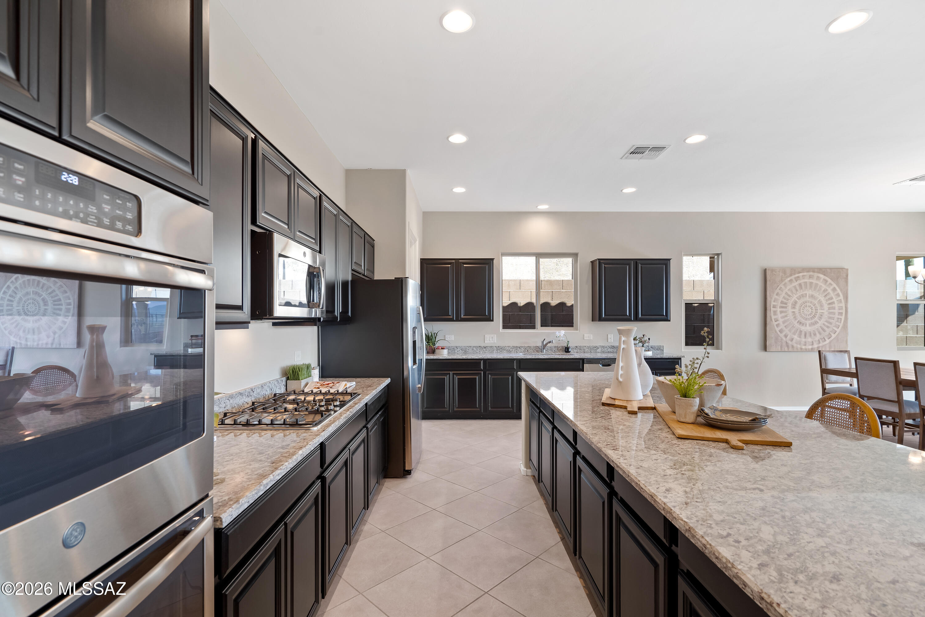 Lightly lived in by the original owners, this ranch-style Timothy plan offers a peaceful retreat with stunning mountain views and a true sense of privacy. The inviting great room flows seamlessly into a well-appointed gourmet kitchen with stainless steel appliances and one of the largest islands you'll see--ideal for both everyday living and entertaining. Three spacious bedrooms each feature generous walk-in closets, while the primary suite provides a private escape with its own luxurious bath. A large study offers flexible space for work or hobbies, and 18'' x 18'' tile enhances the main living areas. Step outside to the expansive covered patio and enjoy serene surroundings and beautiful Arizona sunsets. The Tucson mountain range in the distance is spectacular in late afternoon sun.