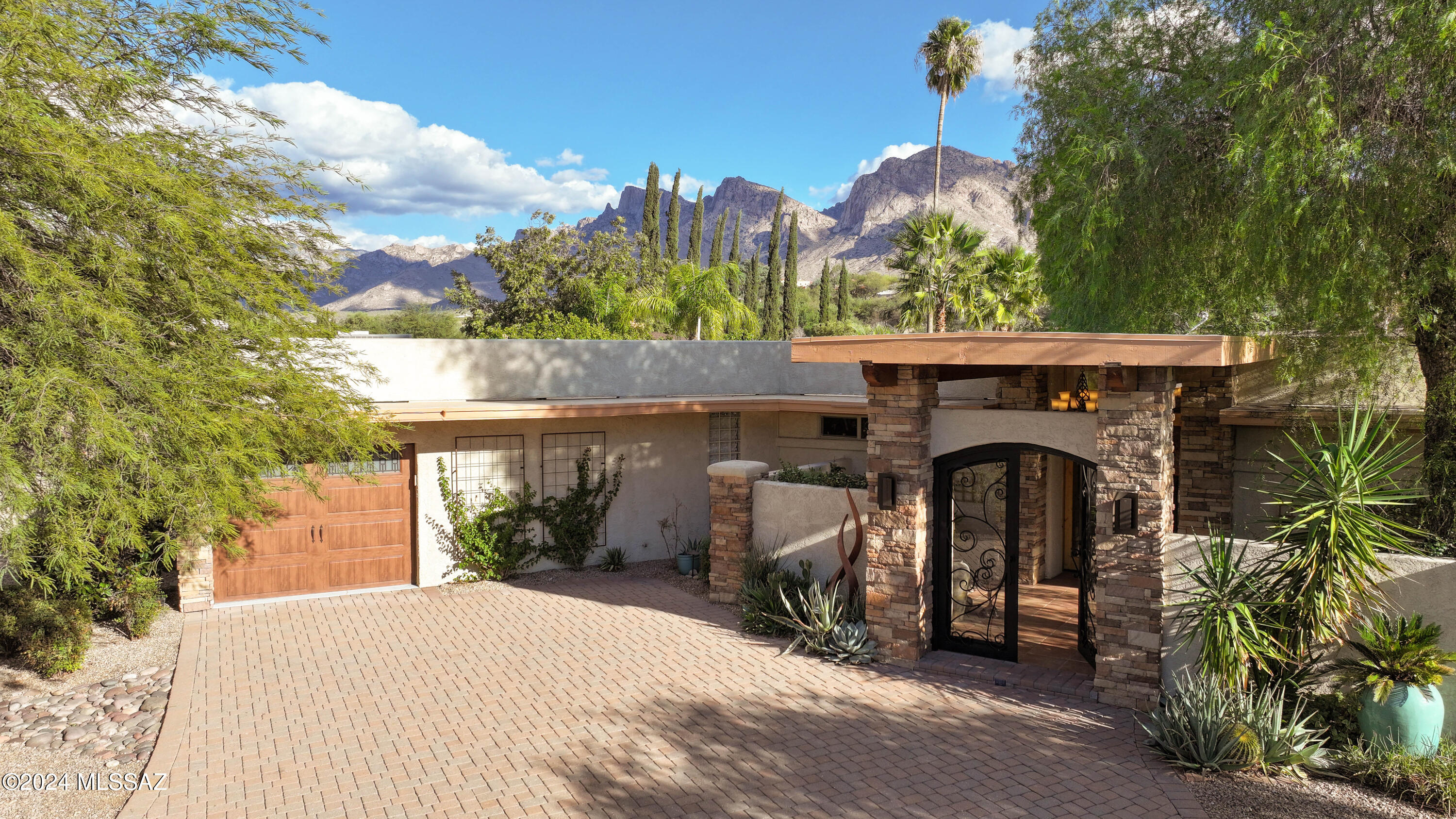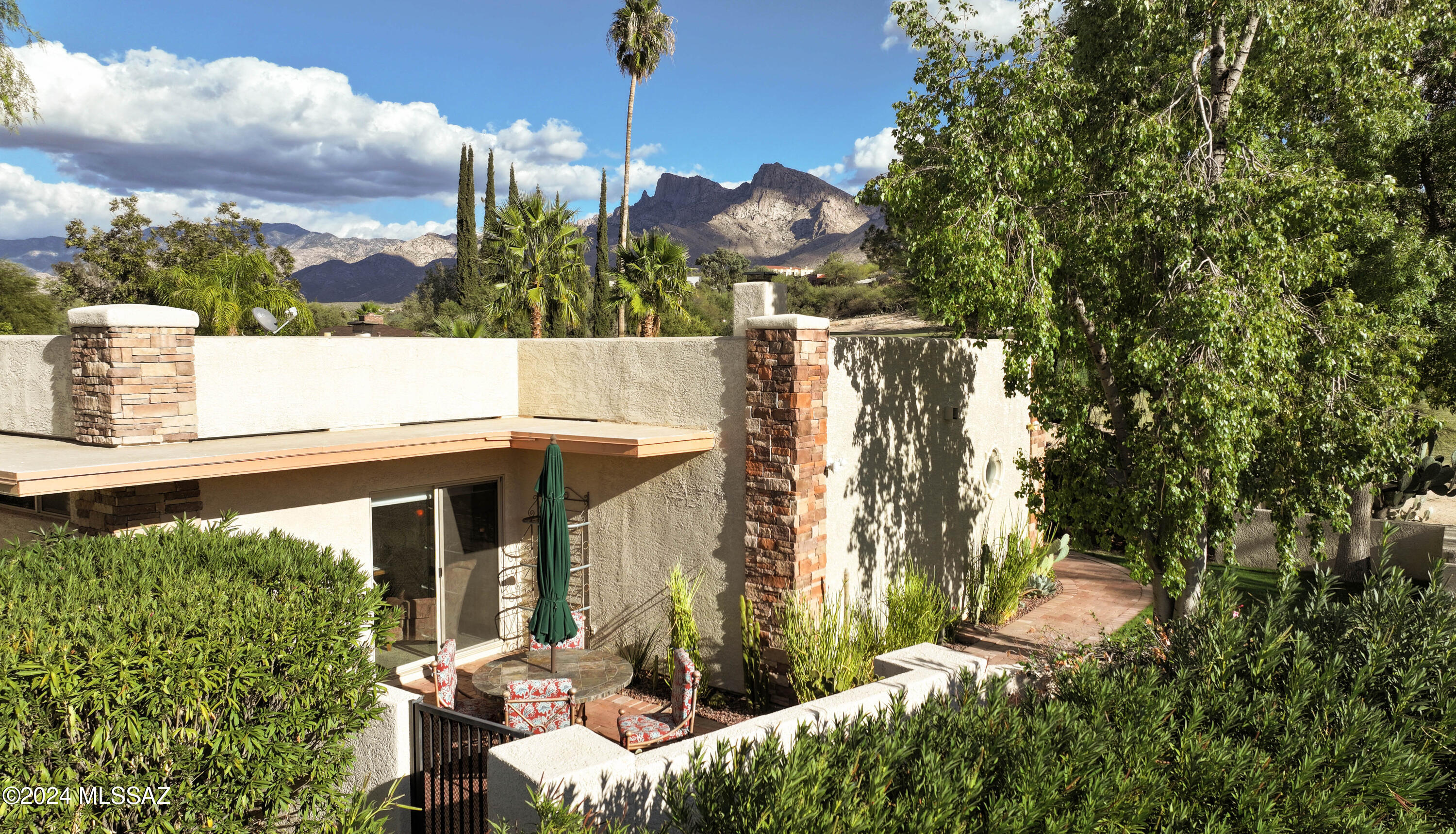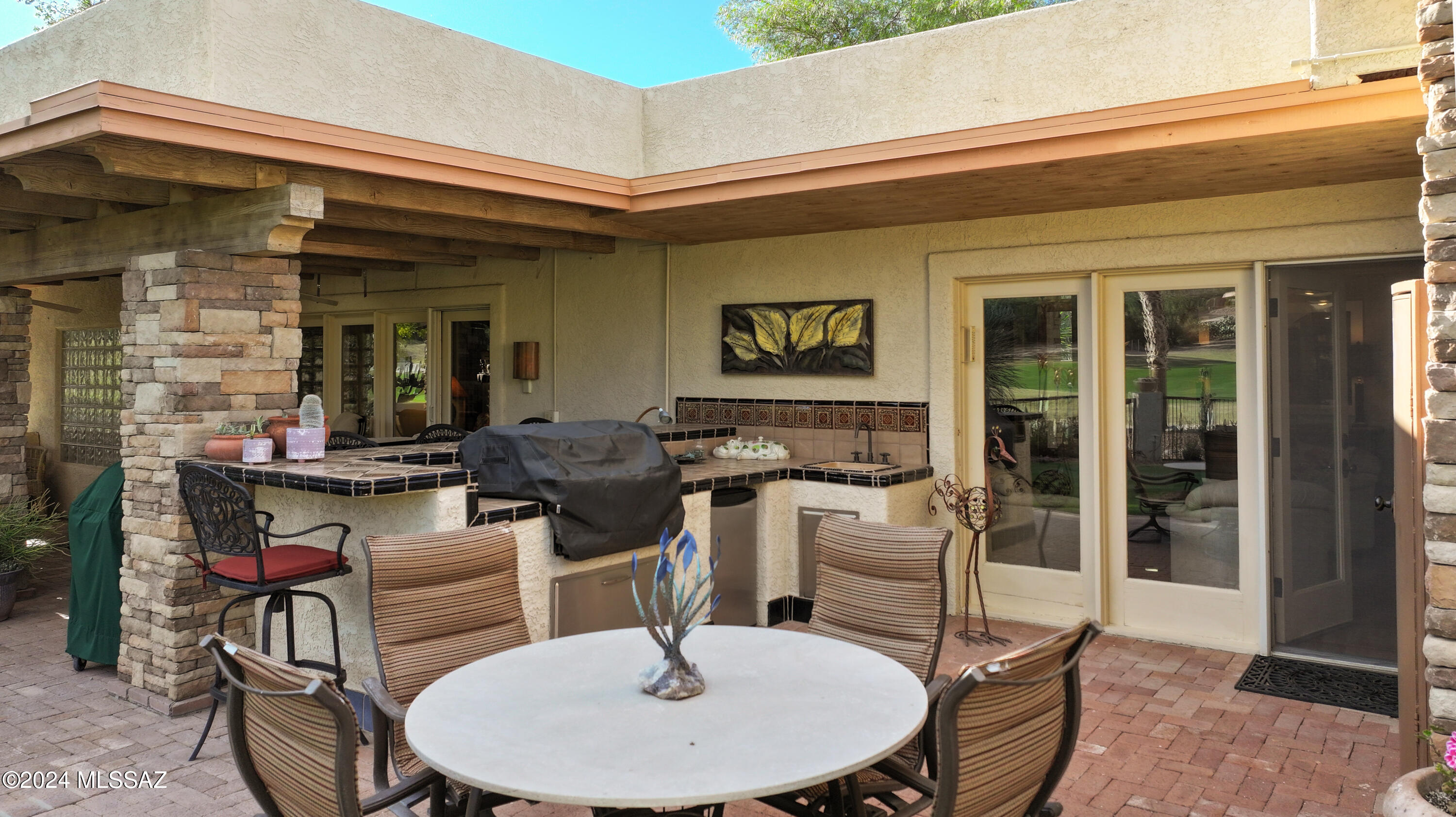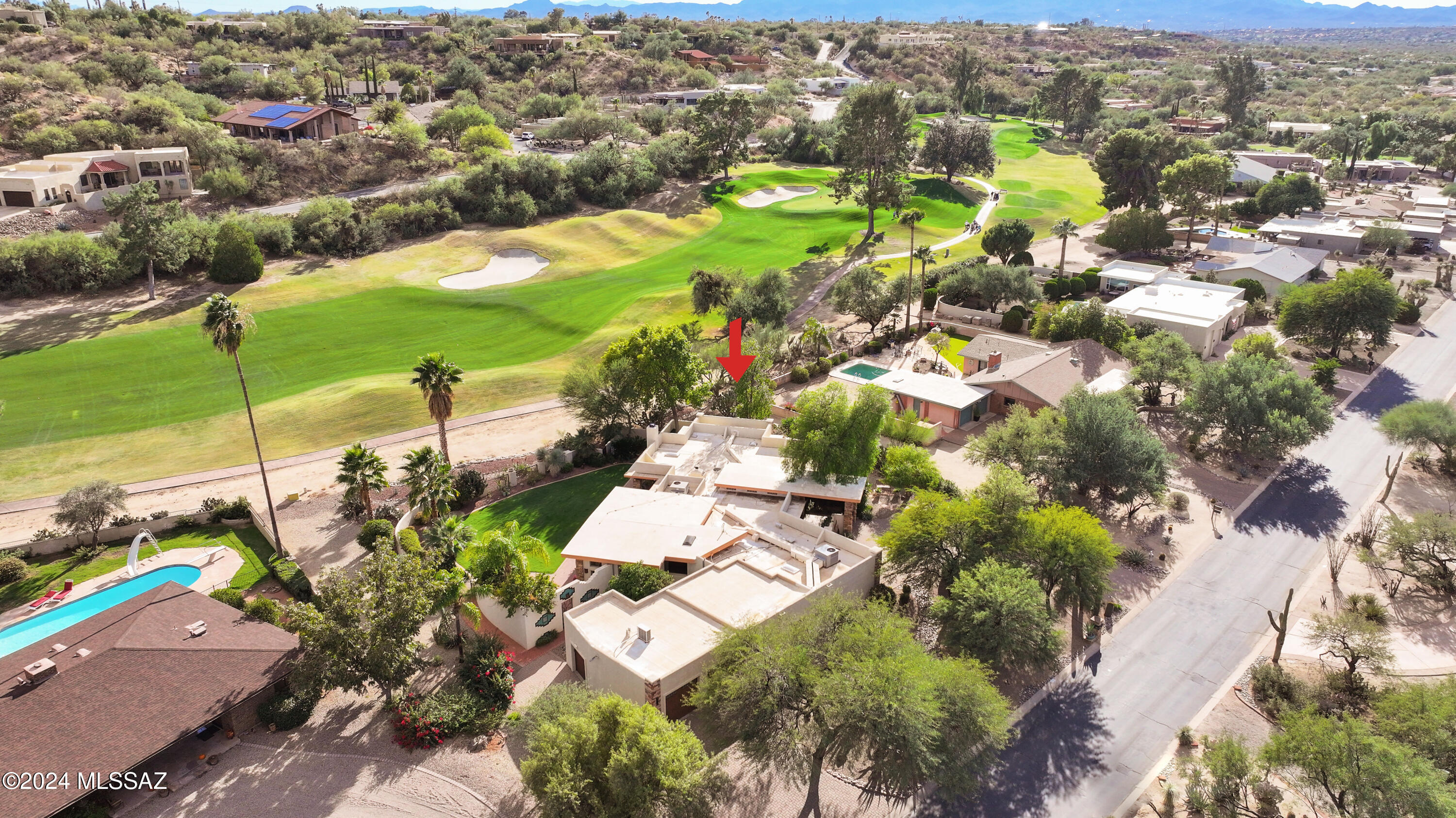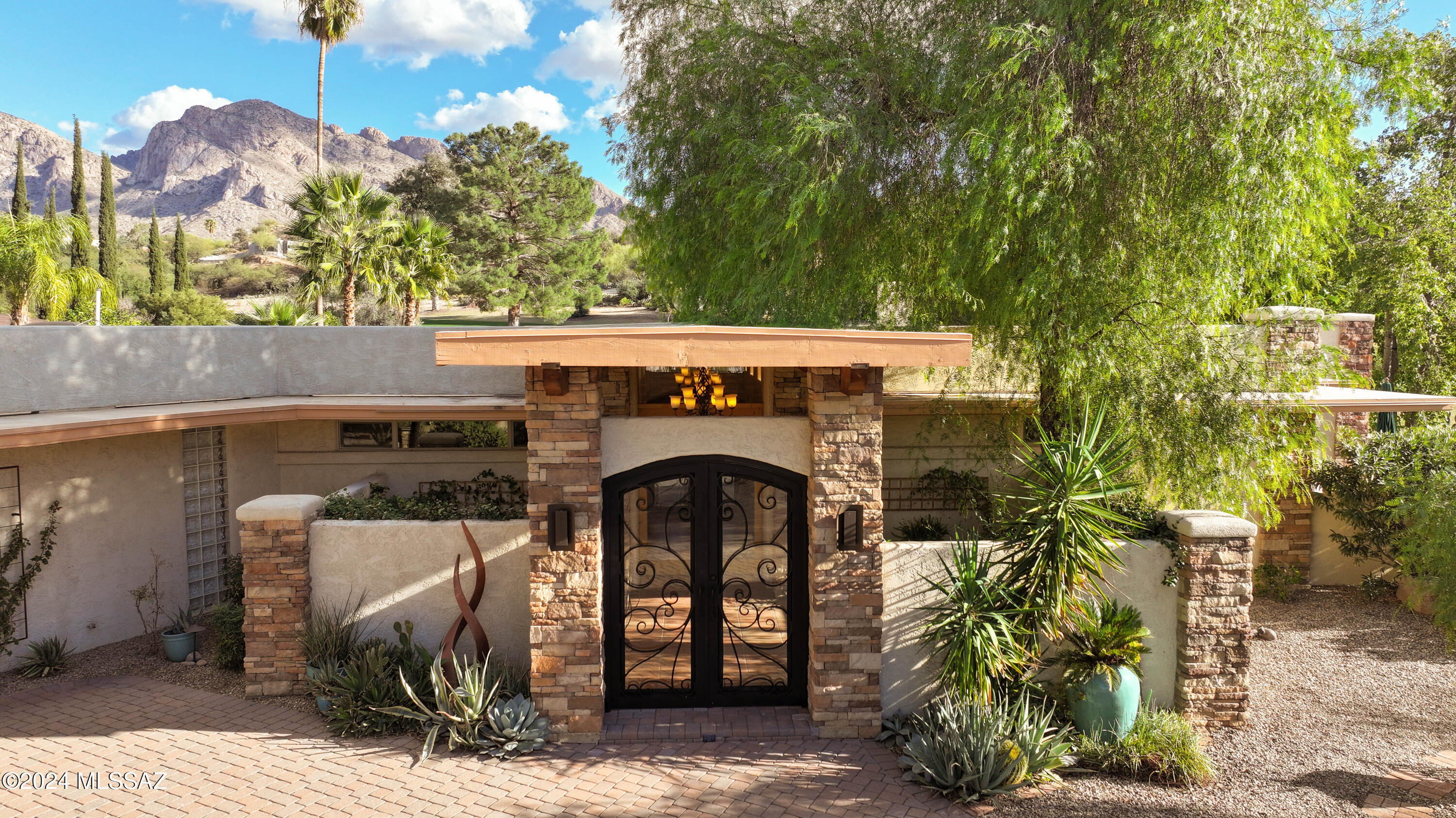 Nestled within the prestigious Oro Valley Country Club, this stunning 3-bedroom, 3.5-bath custom residence perfectly blends sophistication and comfort. Designed with the discerning homeowner in mind, the grand foyer adorned with striking ledger rock accents, sets the tone for the rest of the home. The spacious Great Room boasts a wood-beamed ceiling, a conversation area with gas fireplace, makes it the ideal space for entertaining guests in style. The Chef's dream kitchen features custom knotty alder cabinetry, granite countertops, a farm sink, and a suite of premium stainless-steel appliances including a warming drawer, expansive island and a coffee bar. The piece de resistance is the climate-controlled, 540 bottled wine room--a perfect spot to store your finest vintages. con't. Custom built-in desk and cabinets meets your home office needs. The versatile media/game room is a showstopper, featuring a wet walk-around bar, a 10-foot projection TV, and surround sound. Whether it's movie nights or lively gatherings, this space is sure to impress. Step outside to a beautifully landscaped backyard that adjoins the OVCC Hole #12 fairway. The outdoor kitchen equipped with gas grill, refrigerator, and sink makes al fresco dining a breeze. Unwind in the private hot tub while soaking in the captivating views of Pusch Ridge. The primary suite also includes a secluded patio with a fireplace, dual ceiling fans, and skylights for year-round enjoyment. Escape to the luxurious primary suite, complete with French doors that open to breathtaking backyard and Catalina Mountain views. Enjoy the retreat with gas fireplace, dual custom closets with organizers, and a spa-inspired bathroom with a jetted tub, split vanities, and intricate custom tile work. Each Guest bedroom offers unique comforts. One features a private ensuite with a porcelain copper vanity, while the other boasts a private patio and a nearby bathroom with a waterfall tile shower and glass vessel sink. A remodeled powder room with a sleek modern vessel. Additional amenities include an oversized 2-car garage with a mini-split system and separate garage door for golf cart area. A single car garage with workshop & sink. With 3 HVAC systems and 9 skylights, this home is as energy efficient as it is luxurious. This exquisite property combines luxury, convenience, and thoughtful design, creating the ultimate living experience.