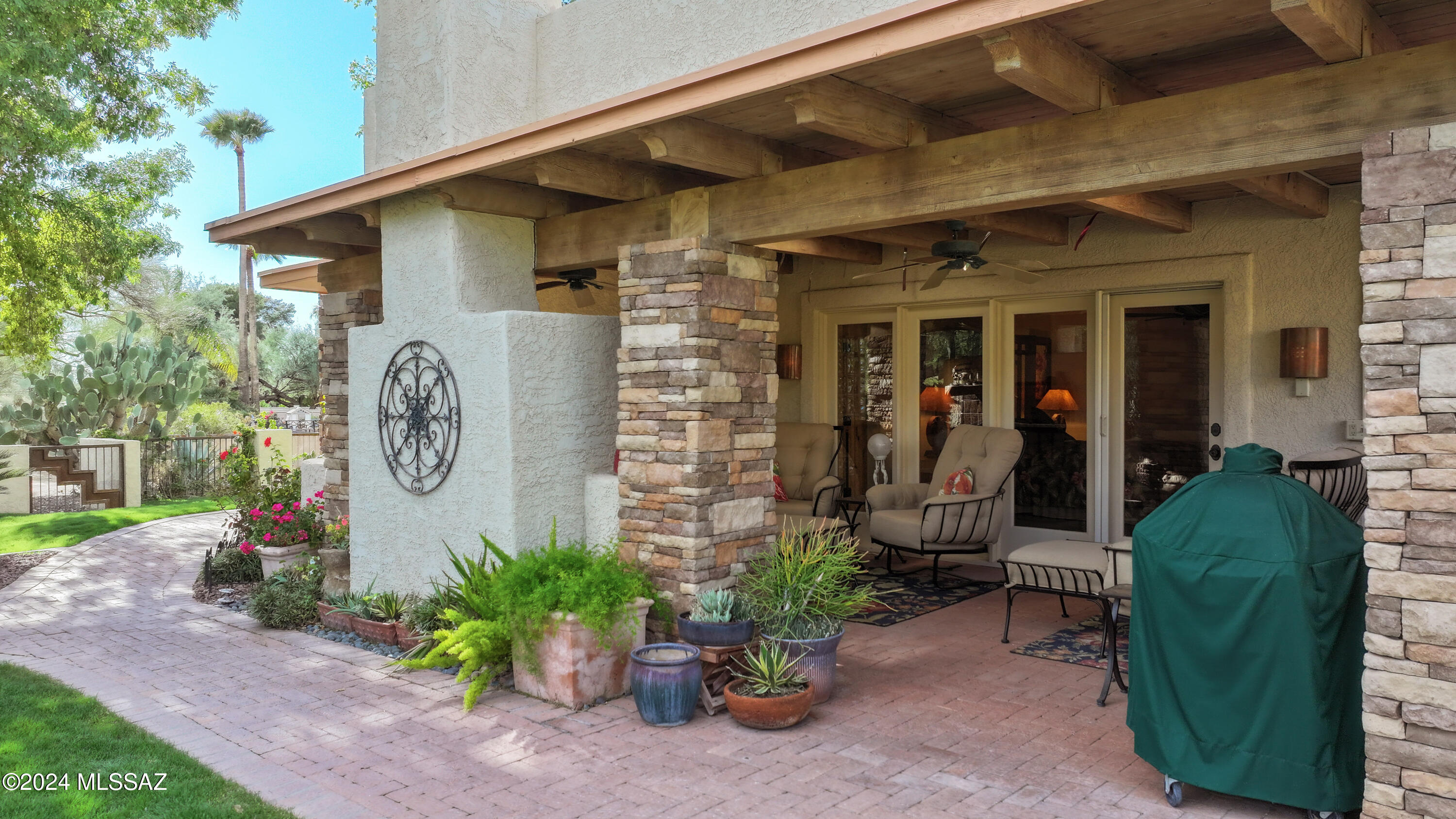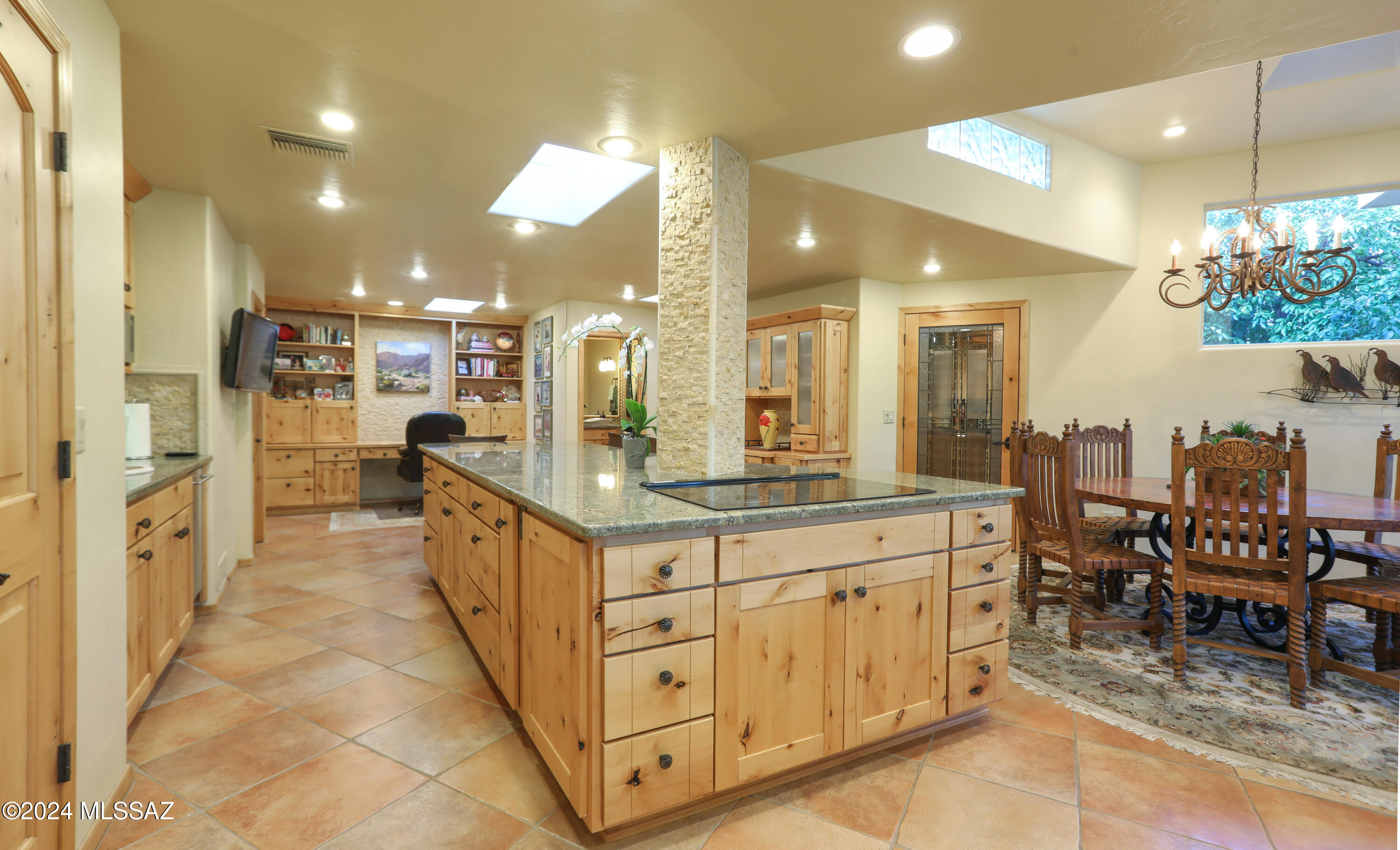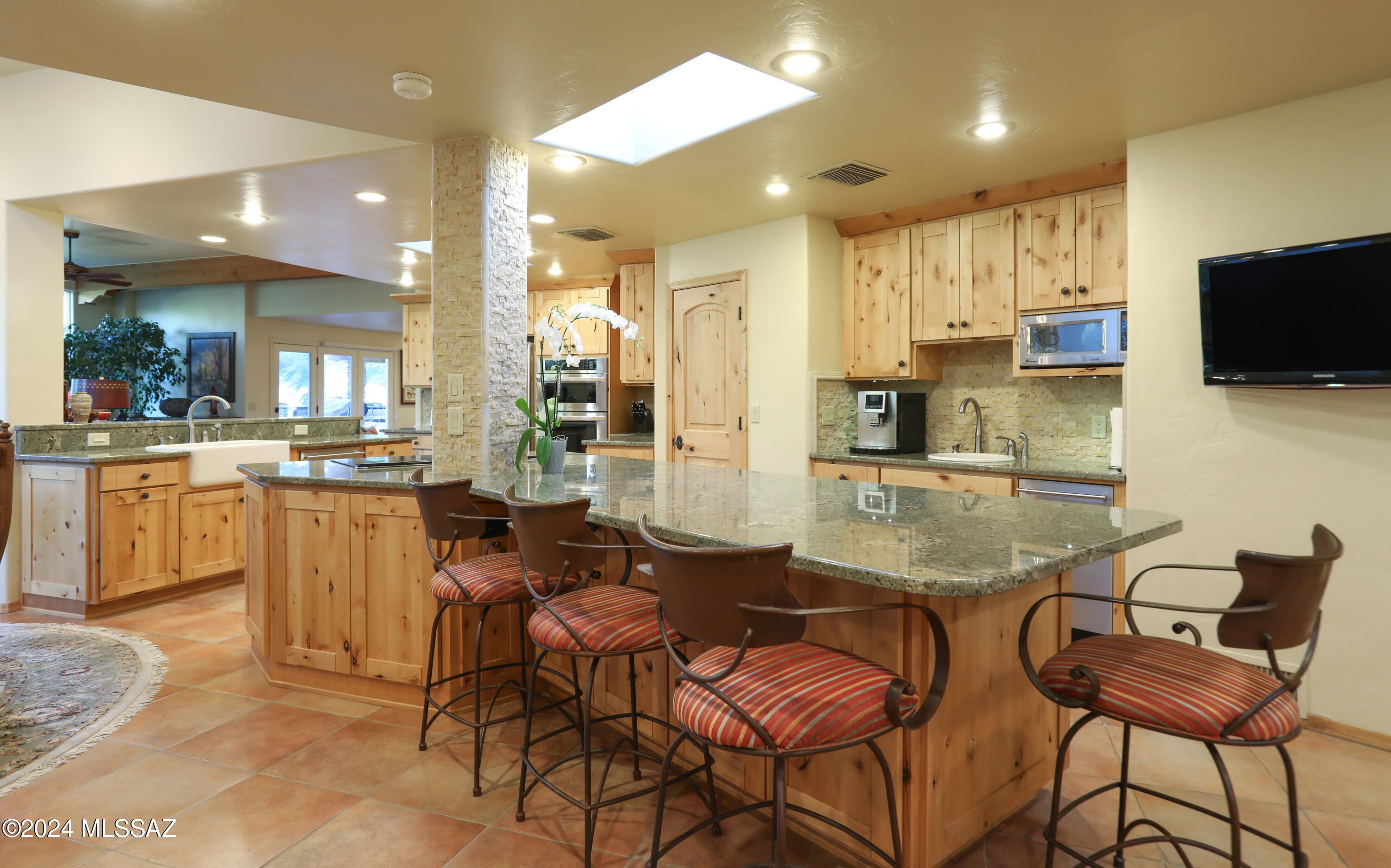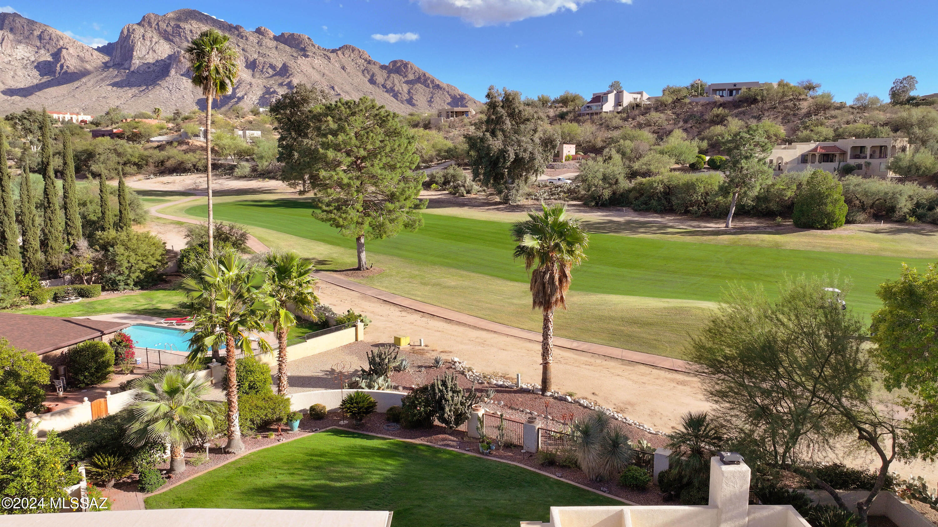 Nestled within the prestigious Oro Valley Country Club, this stunning 3-bedroom, 3.5-bath custom residence perfectly blends sophistication and comfort. Designed with the discerning homeowner in mind, the grand foyer adorned with striking ledger rock accents, sets the tone for the rest of the home. The spacious Great Room boasts a wood-beamed ceiling, a conversation area with gas fireplace, makes it the ideal space for entertaining guests in style. The Chef's dream kitchen features custom knotty alder cabinetry, granite countertops, a farm sink, and a suite of premium stainless-steel appliances including a warming drawer, expansive island and a coffee bar. The piece de resistance is the climate-controlled, 540 bottled wine room--a perfect spot to store your finest vintages. con't. Custom built-in desk and cabinets meets your home office needs. The versatile media/game room is a showstopper, featuring a wet walk-around bar, a 10-foot projection TV, and surround sound. Whether it's movie nights or lively gatherings, this space is sure to impress. Step outside to a beautifully landscaped backyard that adjoins the OVCC Hole #12 fairway. The outdoor kitchen equipped with gas grill, refrigerator, and sink makes al fresco dining a breeze. Unwind in the private hot tub while soaking in the captivating views of Pusch Ridge. The primary suite also includes a secluded patio with a fireplace, dual ceiling fans, and skylights for year-round enjoyment. Escape to the luxurious primary suite, complete with French doors that open to breathtaking backyard and Catalina Mountain views. Enjoy the retreat with gas fireplace, dual custom closets with organizers, and a spa-inspired bathroom with a jetted tub, split vanities, and intricate custom tile work. Each Guest bedroom offers unique comforts. One features a private ensuite with a porcelain copper vanity, while the other boasts a private patio and a nearby bathroom with a waterfall tile shower and glass vessel sink. A remodeled powder room with a sleek modern vessel. Additional amenities include an oversized 2-car garage with a mini-split system and separate garage door for golf cart area. A single car garage with workshop & sink. With 3 HVAC systems and 9 skylights, this home is as energy efficient as it is luxurious. This exquisite property combines luxury, convenience, and thoughtful design, creating the ultimate living experience.