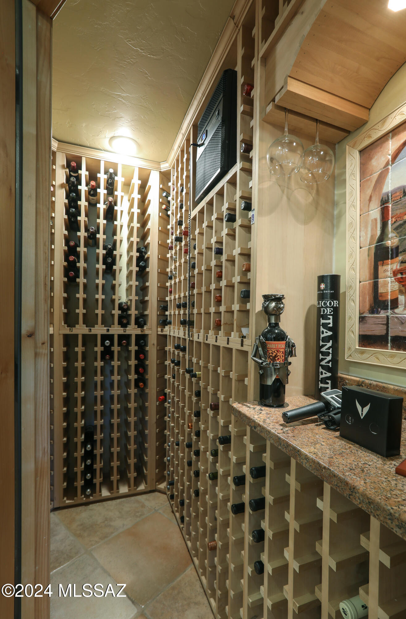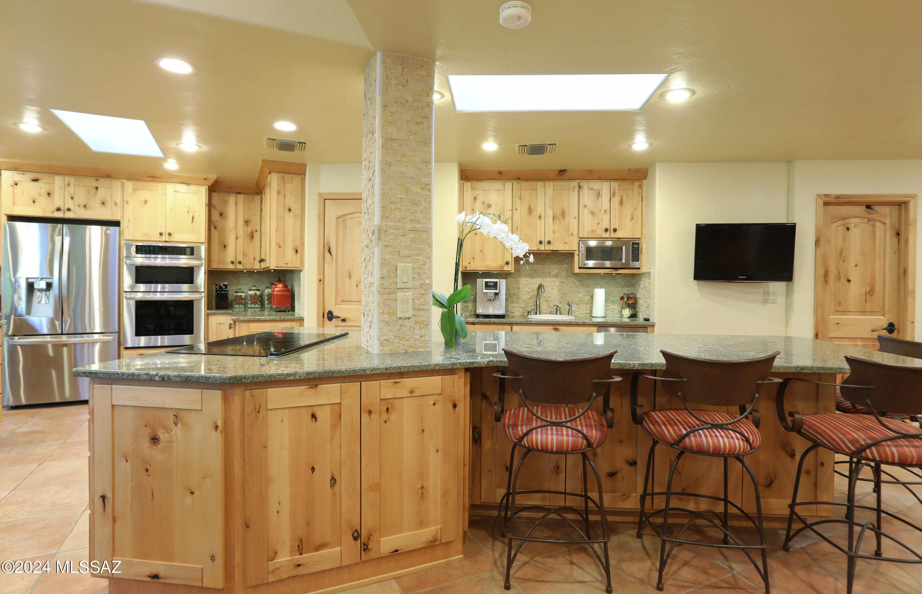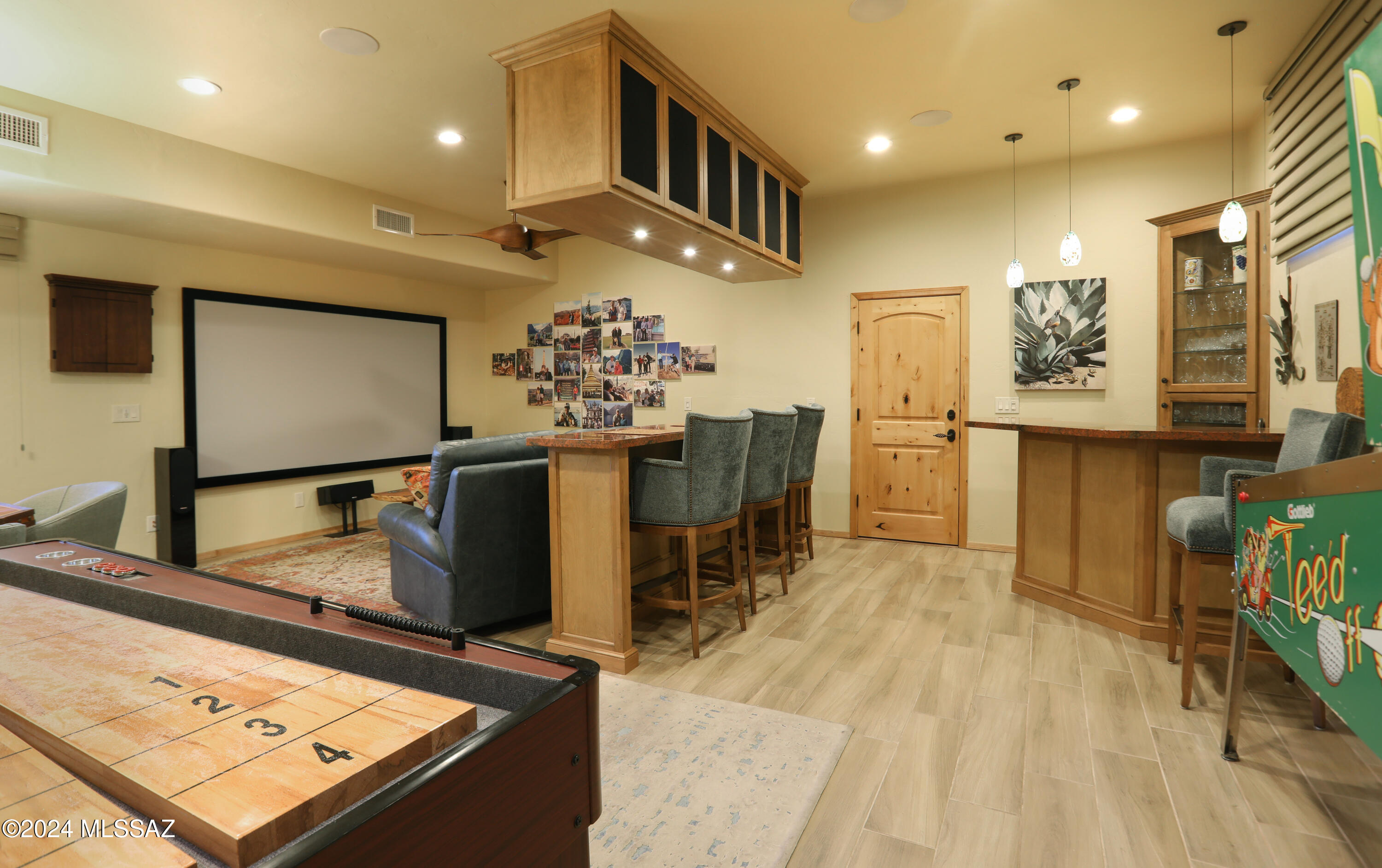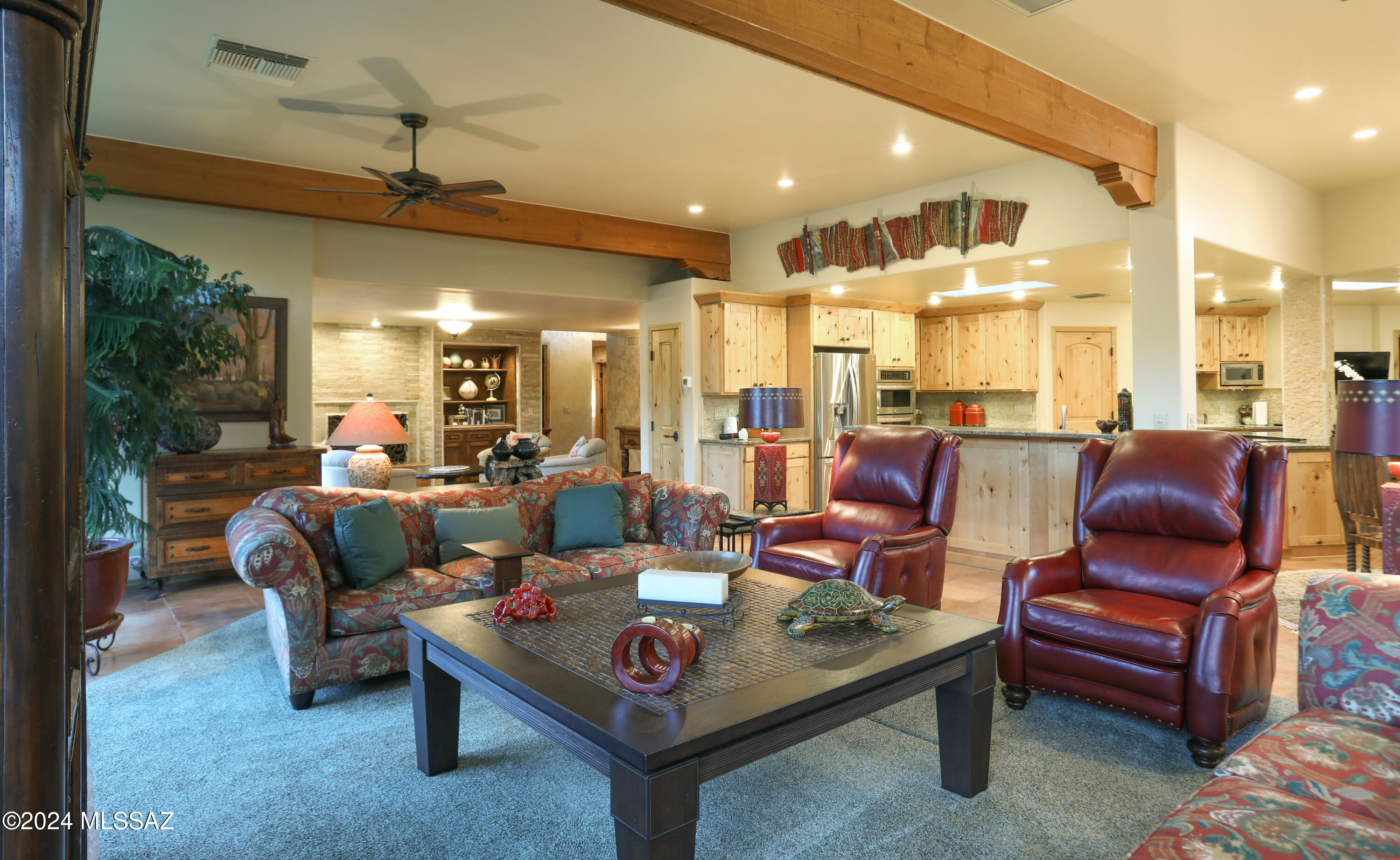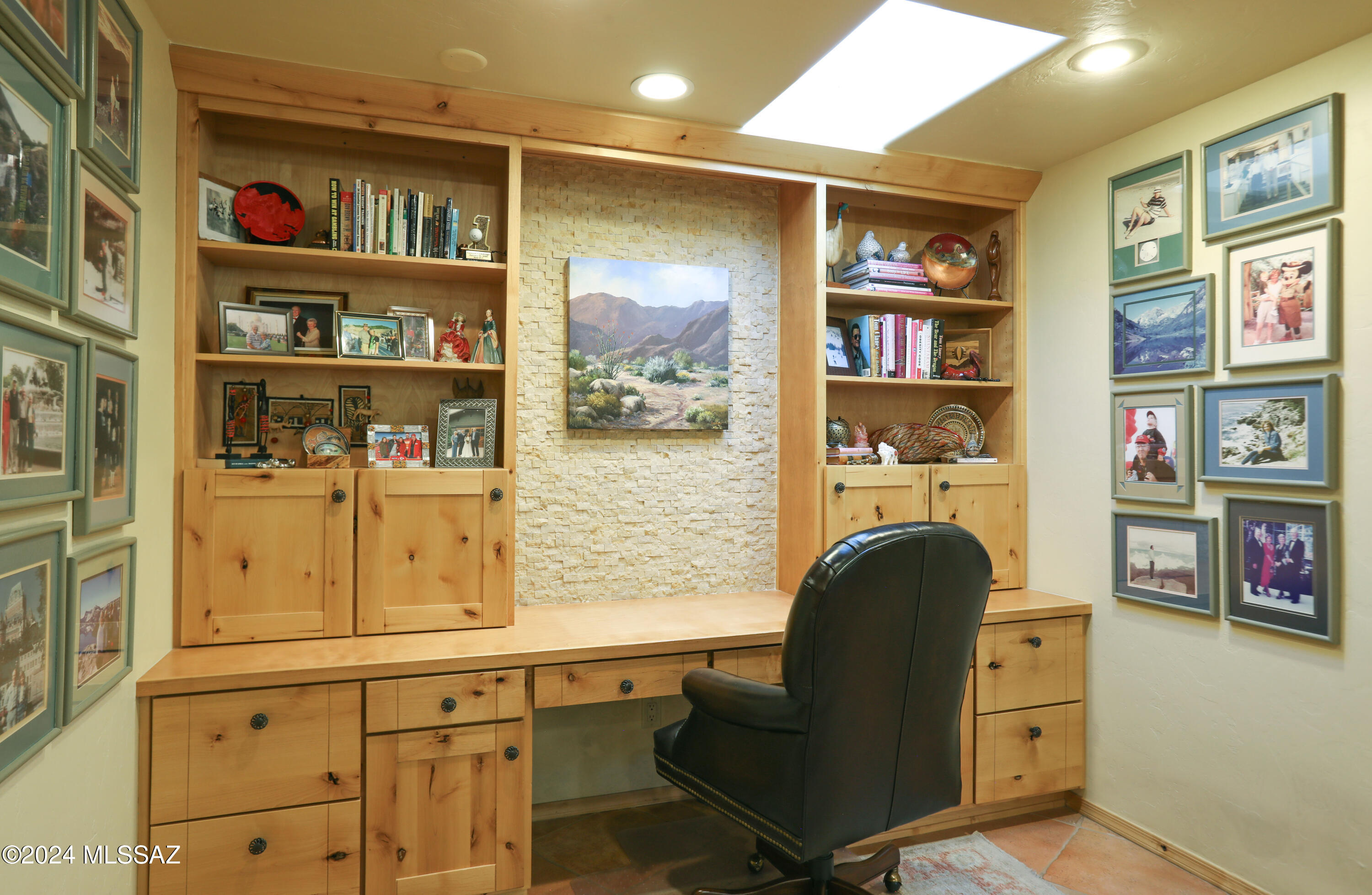 Nestled within the prestigious Oro Valley Country Club, this stunning 3-bedroom, 3.5-bath custom residence perfectly blends sophistication and comfort. Designed with the discerning homeowner in mind, the grand foyer adorned with striking ledger rock accents, sets the tone for the rest of the home. The spacious Great Room boasts a wood-beamed ceiling, a conversation area with gas fireplace, makes it the ideal space for entertaining guests in style. The Chef's dream kitchen features custom knotty alder cabinetry, granite countertops, a farm sink, and a suite of premium stainless-steel appliances including a warming drawer, expansive island and a coffee bar. The piece de resistance is the climate-controlled, 540 bottled wine room--a perfect spot to store your finest vintages. con't. Custom built-in desk and cabinets meets your home office needs. The versatile media/game room is a showstopper, featuring a wet walk-around bar, a 10-foot projection TV, and surround sound. Whether it's movie nights or lively gatherings, this space is sure to impress. Step outside to a beautifully landscaped backyard that adjoins the OVCC Hole #12 fairway. The outdoor kitchen equipped with gas grill, refrigerator, and sink makes al fresco dining a breeze. Unwind in the private hot tub while soaking in the captivating views of Pusch Ridge. The primary suite also includes a secluded patio with a fireplace, dual ceiling fans, and skylights for year-round enjoyment. Escape to the luxurious primary suite, complete with French doors that open to breathtaking backyard and Catalina Mountain views. Enjoy the retreat with gas fireplace, dual custom closets with organizers, and a spa-inspired bathroom with a jetted tub, split vanities, and intricate custom tile work. Each Guest bedroom offers unique comforts. One features a private ensuite with a porcelain copper vanity, while the other boasts a private patio and a nearby bathroom with a waterfall tile shower and glass vessel sink. A remodeled powder room with a sleek modern vessel. Additional amenities include an oversized 2-car garage with a mini-split system and separate garage door for golf cart area. A single car garage with workshop & sink. With 3 HVAC systems and 9 skylights, this home is as energy efficient as it is luxurious. This exquisite property combines luxury, convenience, and thoughtful design, creating the ultimate living experience.
