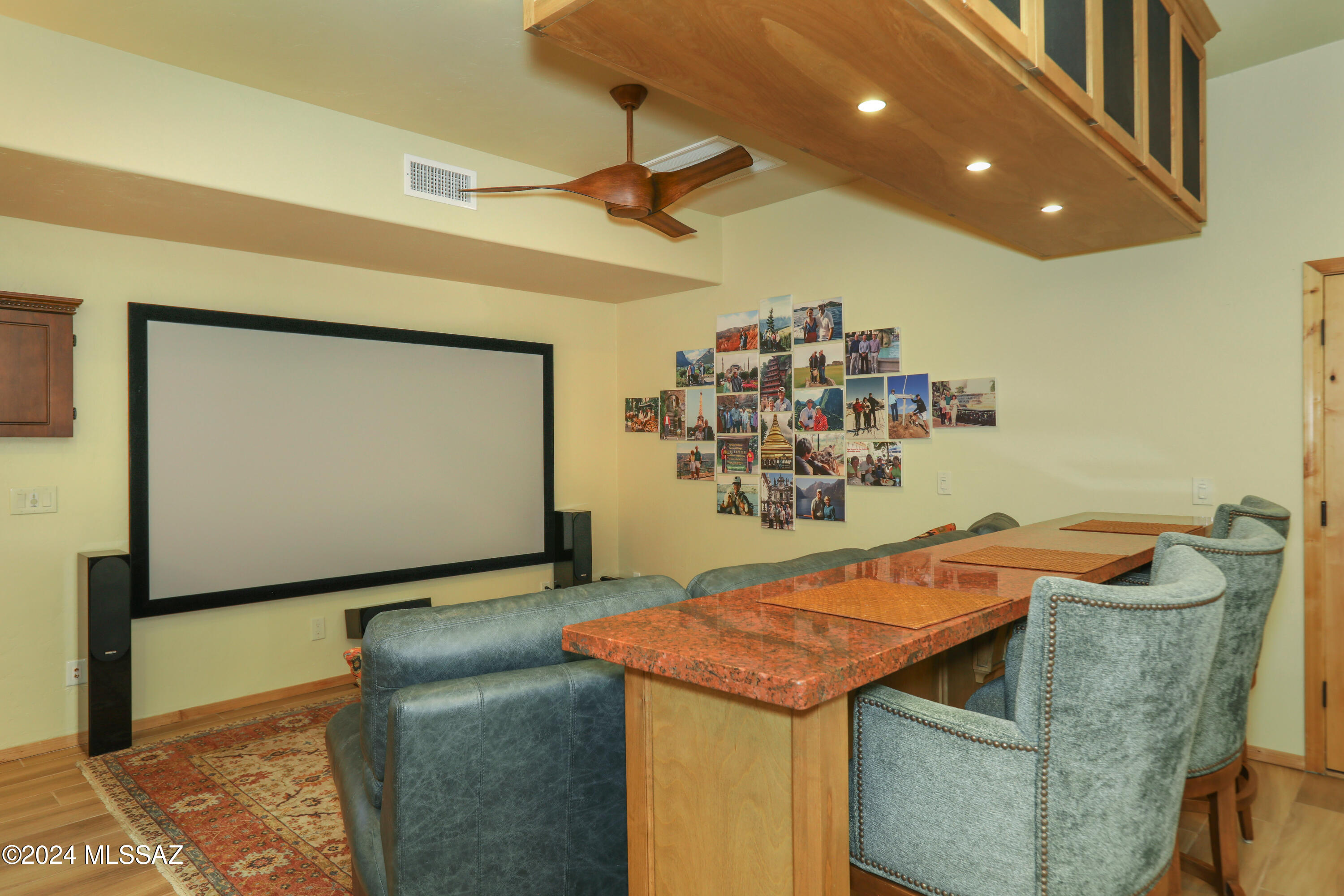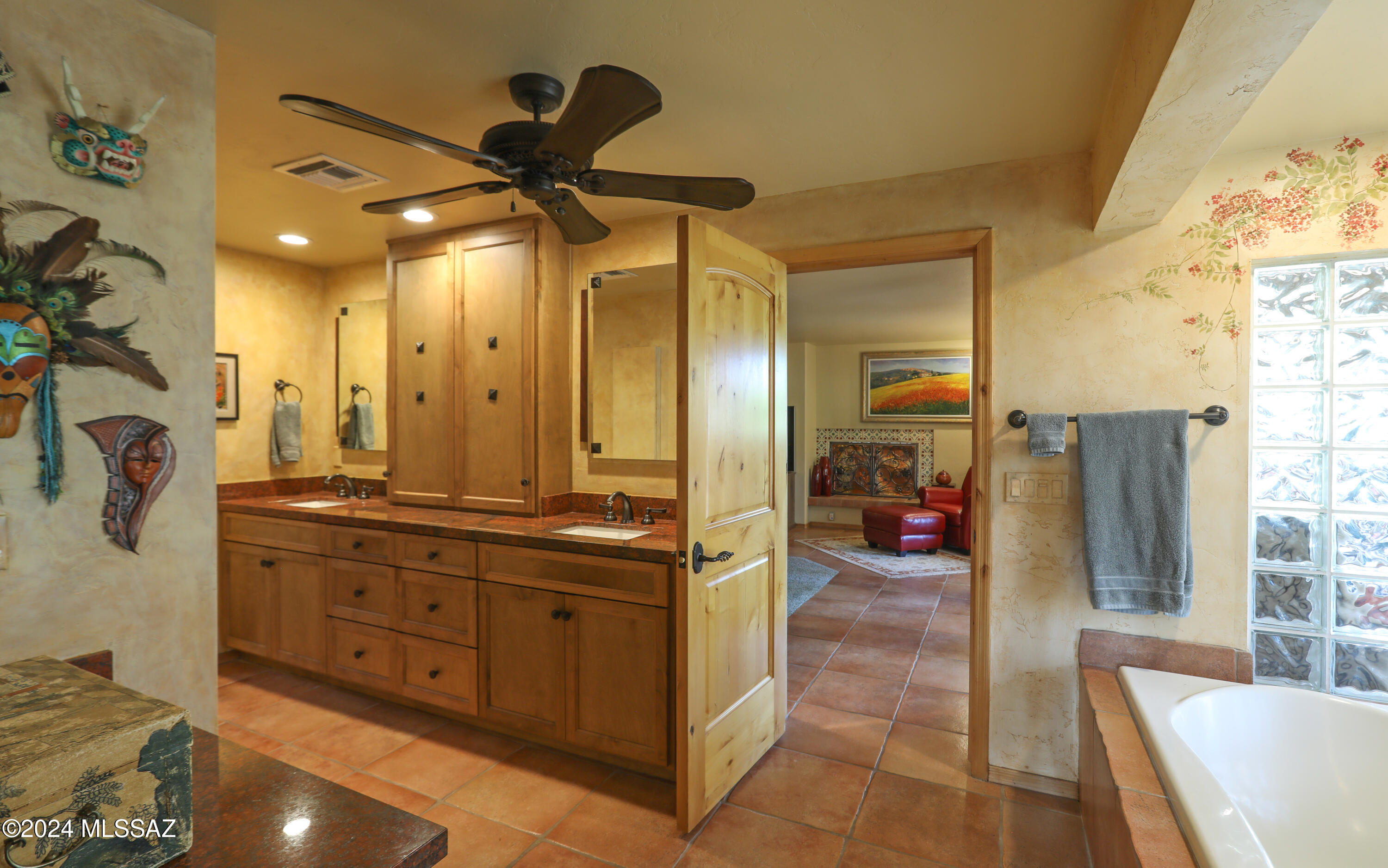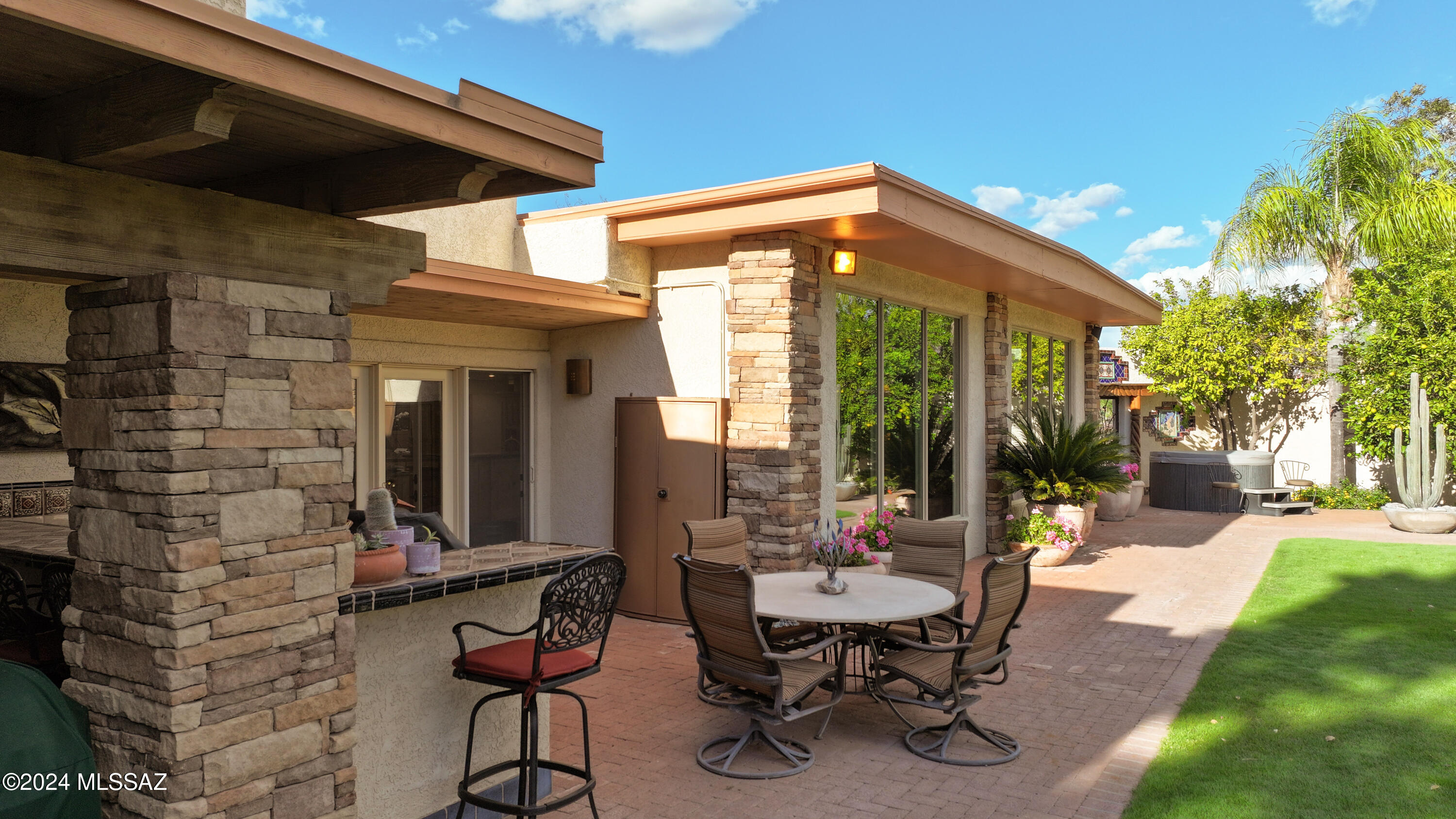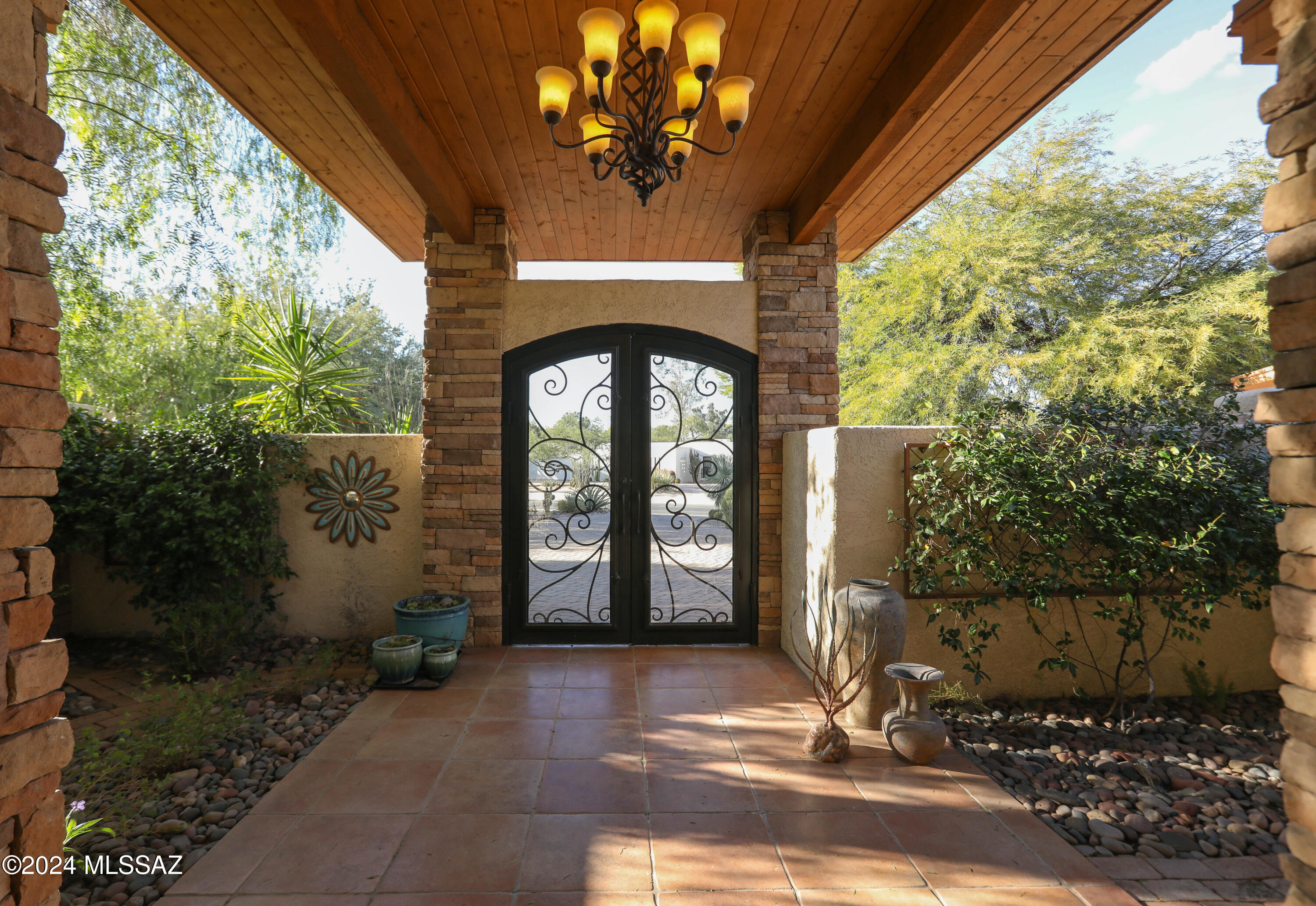 Nestled within the prestigious Oro Valley Country Club, this stunning 3-bedroom, 3.5-bath custom residence perfectly blends sophistication and comfort. Designed with the discerning homeowner in mind, the grand foyer adorned with striking ledger rock accents, sets the tone for the rest of the home. The spacious Great Room boasts a wood-beamed ceiling, a conversation area with gas fireplace, makes it the ideal space for entertaining guests in style. The Chef's dream kitchen features custom knotty alder cabinetry, granite countertops, a farm sink, and a suite of premium stainless-steel appliances including a warming drawer, expansive island and a coffee bar. The piece de resistance is the climate-controlled, 540 bottled wine room--a perfect spot to store your finest vintages. con't. Custom built-in desk and cabinets meets your home office needs. The versatile media/game room is a showstopper, featuring a wet walk-around bar, a 10-foot projection TV, and surround sound. Whether it's movie nights or lively gatherings, this space is sure to impress. Step outside to a beautifully landscaped backyard that adjoins the OVCC Hole #12 fairway. The outdoor kitchen equipped with gas grill, refrigerator, and sink makes al fresco dining a breeze. Unwind in the private hot tub while soaking in the captivating views of Pusch Ridge. The primary suite also includes a secluded patio with a fireplace, dual ceiling fans, and skylights for year-round enjoyment. Escape to the luxurious primary suite, complete with French doors that open to breathtaking backyard and Catalina Mountain views. Enjoy the retreat with gas fireplace, dual custom closets with organizers, and a spa-inspired bathroom with a jetted tub, split vanities, and intricate custom tile work. Each Guest bedroom offers unique comforts. One features a private ensuite with a porcelain copper vanity, while the other boasts a private patio and a nearby bathroom with a waterfall tile shower and glass vessel sink. A remodeled powder room with a sleek modern vessel. Additional amenities include an oversized 2-car garage with a mini-split system and separate garage door for golf cart area. A single car garage with workshop & sink. With 3 HVAC systems and 9 skylights, this home is as energy efficient as it is luxurious. This exquisite property combines luxury, convenience, and thoughtful design, creating the ultimate living experience.