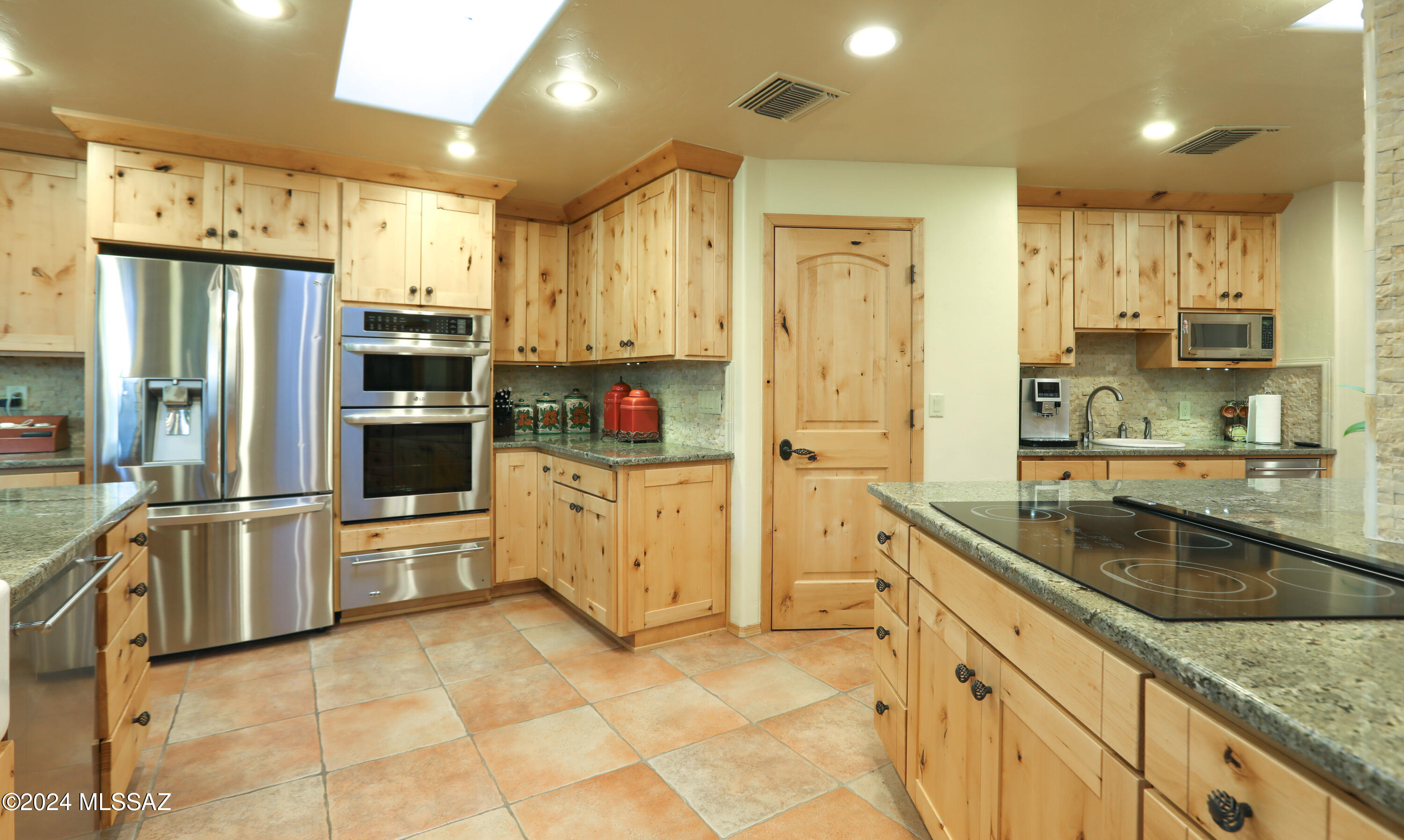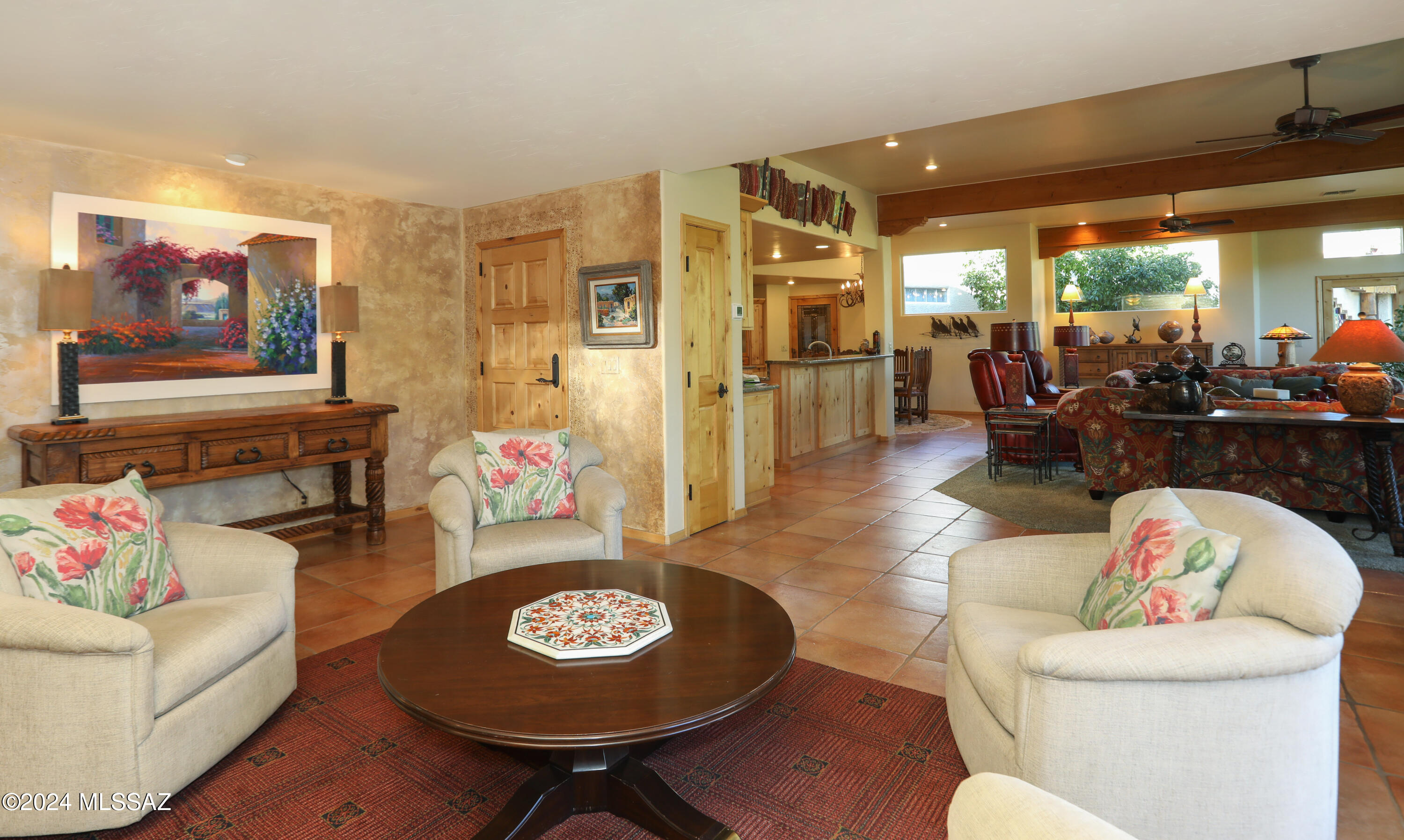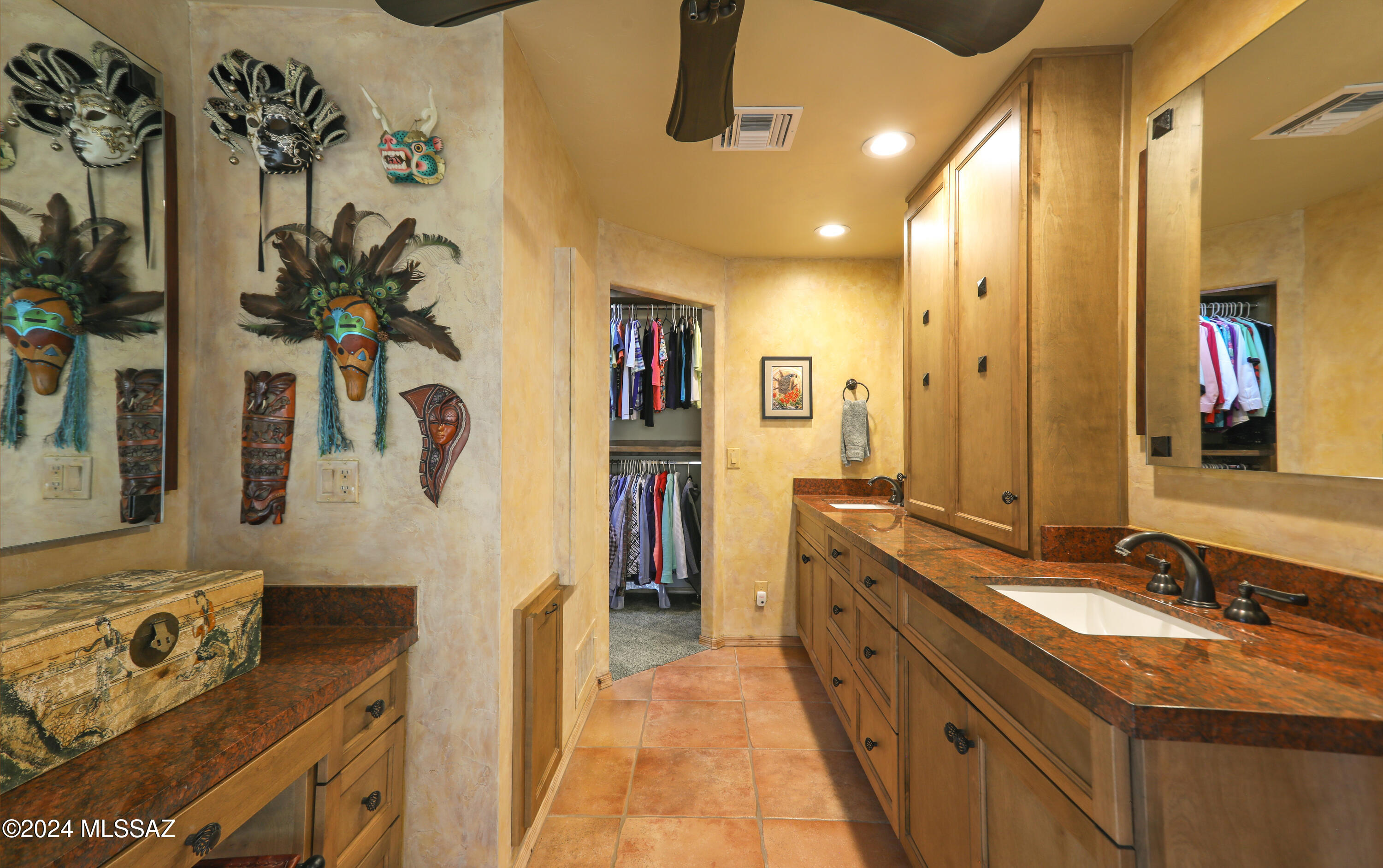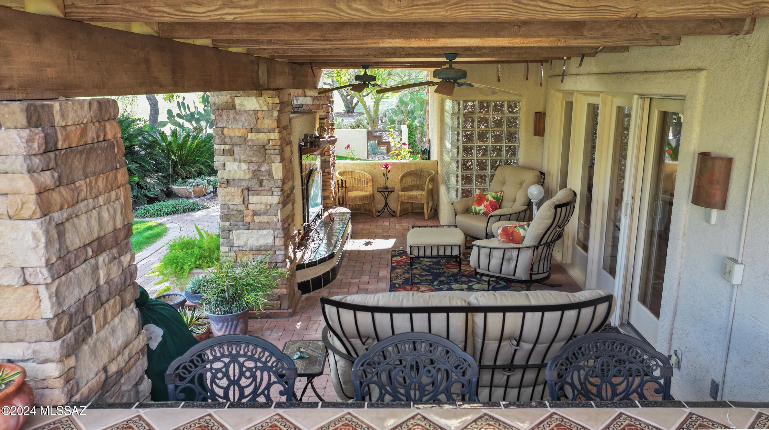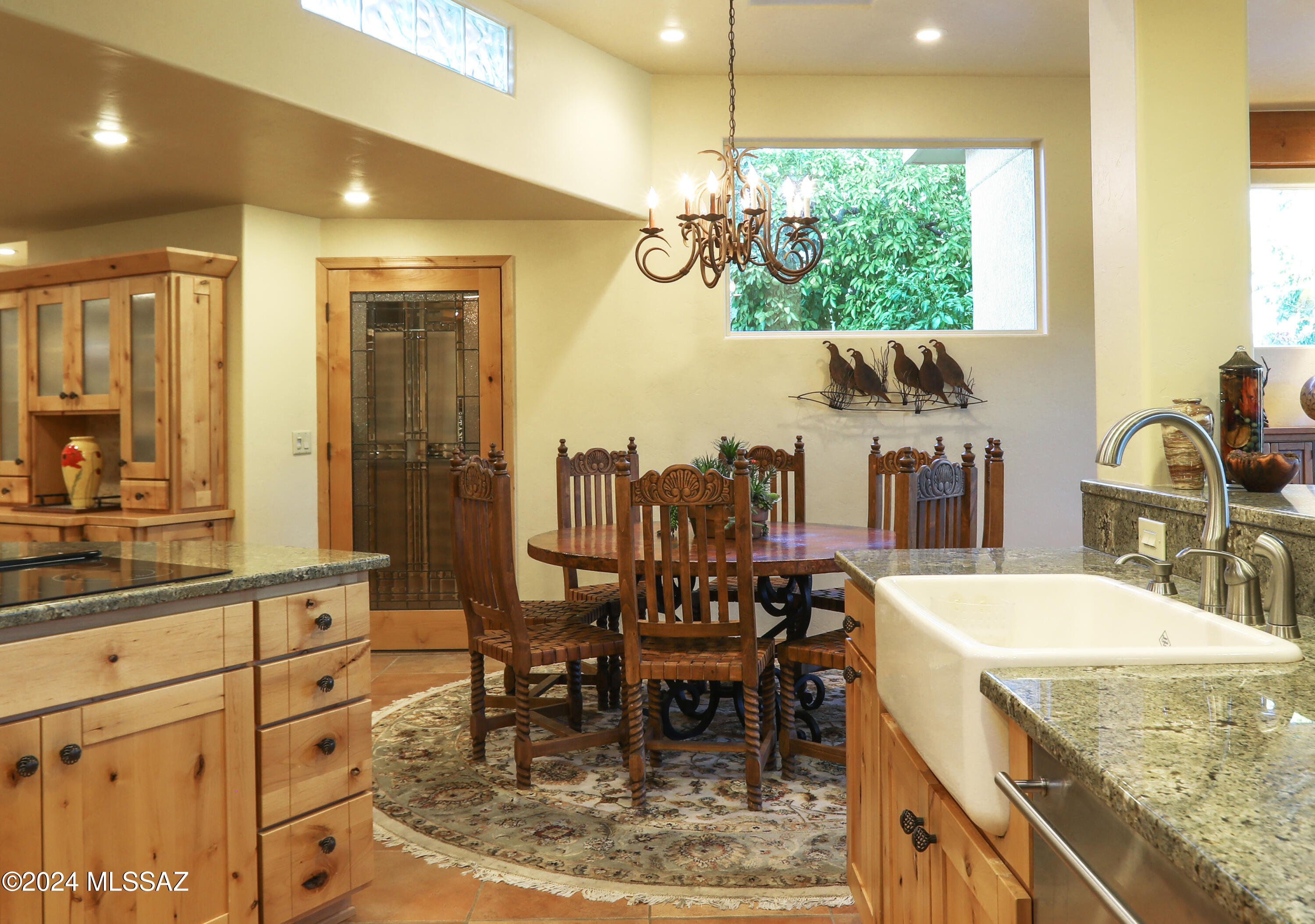 Nestled within the prestigious Oro Valley Country Club, this stunning 3-bedroom, 3.5-bath custom residence perfectly blends sophistication and comfort. Designed with the discerning homeowner in mind, the grand foyer adorned with striking ledger rock accents, sets the tone for the rest of the home. The spacious Great Room boasts a wood-beamed ceiling, a conversation area with gas fireplace, makes it the ideal space for entertaining guests in style. The Chef's dream kitchen features custom knotty alder cabinetry, granite countertops, a farm sink, and a suite of premium stainless-steel appliances including a warming drawer, expansive island and a coffee bar. The piece de resistance is the climate-controlled, 540 bottled wine room--a perfect spot to store your finest vintages. con't. Custom built-in desk and cabinets meets your home office needs. The versatile media/game room is a showstopper, featuring a wet walk-around bar, a 10-foot projection TV, and surround sound. Whether it's movie nights or lively gatherings, this space is sure to impress. Step outside to a beautifully landscaped backyard that adjoins the OVCC Hole #12 fairway. The outdoor kitchen equipped with gas grill, refrigerator, and sink makes al fresco dining a breeze. Unwind in the private hot tub while soaking in the captivating views of Pusch Ridge. The primary suite also includes a secluded patio with a fireplace, dual ceiling fans, and skylights for year-round enjoyment. Escape to the luxurious primary suite, complete with French doors that open to breathtaking backyard and Catalina Mountain views. Enjoy the retreat with gas fireplace, dual custom closets with organizers, and a spa-inspired bathroom with a jetted tub, split vanities, and intricate custom tile work. Each Guest bedroom offers unique comforts. One features a private ensuite with a porcelain copper vanity, while the other boasts a private patio and a nearby bathroom with a waterfall tile shower and glass vessel sink. A remodeled powder room with a sleek modern vessel. Additional amenities include an oversized 2-car garage with a mini-split system and separate garage door for golf cart area. A single car garage with workshop & sink. With 3 HVAC systems and 9 skylights, this home is as energy efficient as it is luxurious. This exquisite property combines luxury, convenience, and thoughtful design, creating the ultimate living experience.