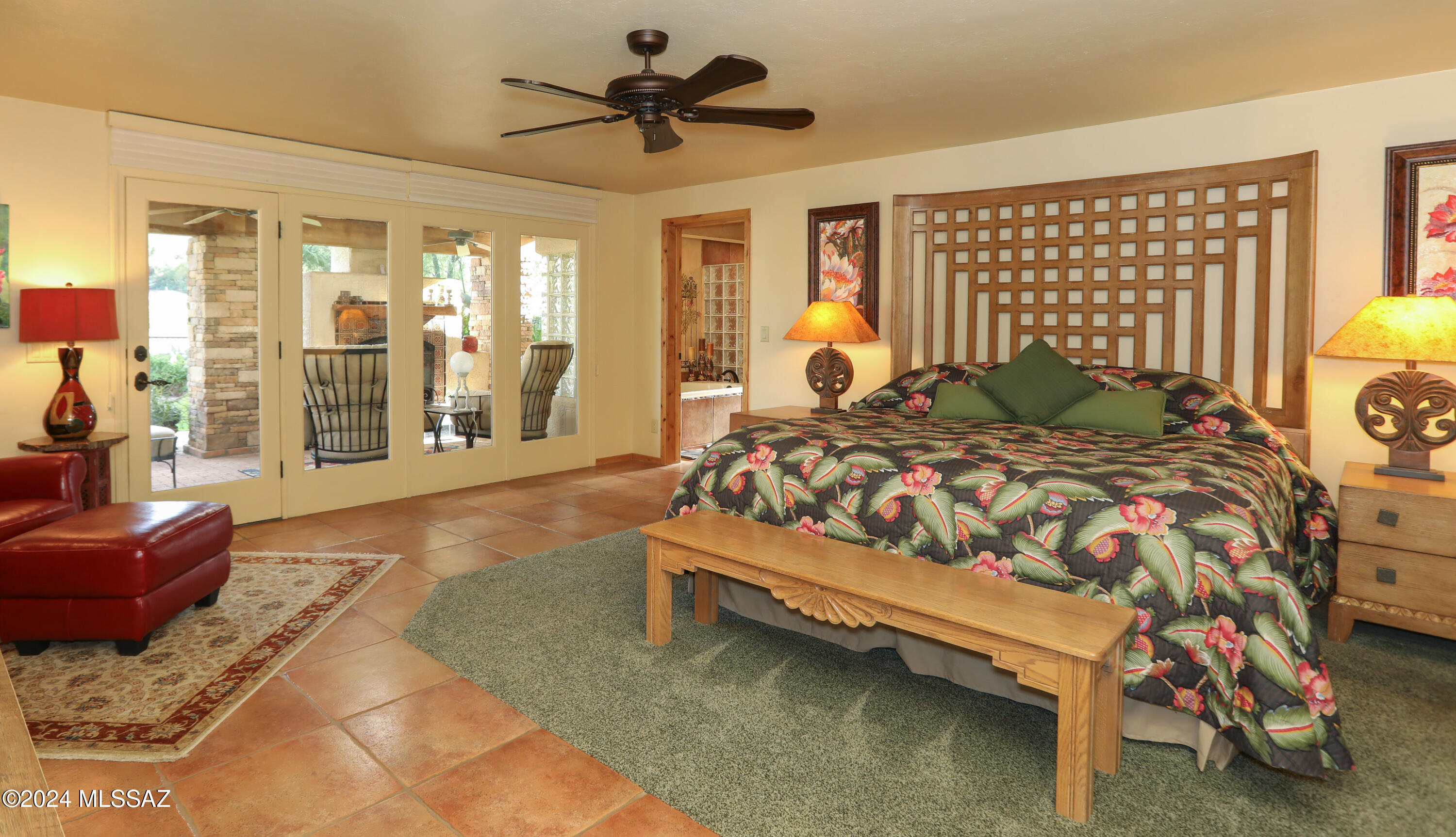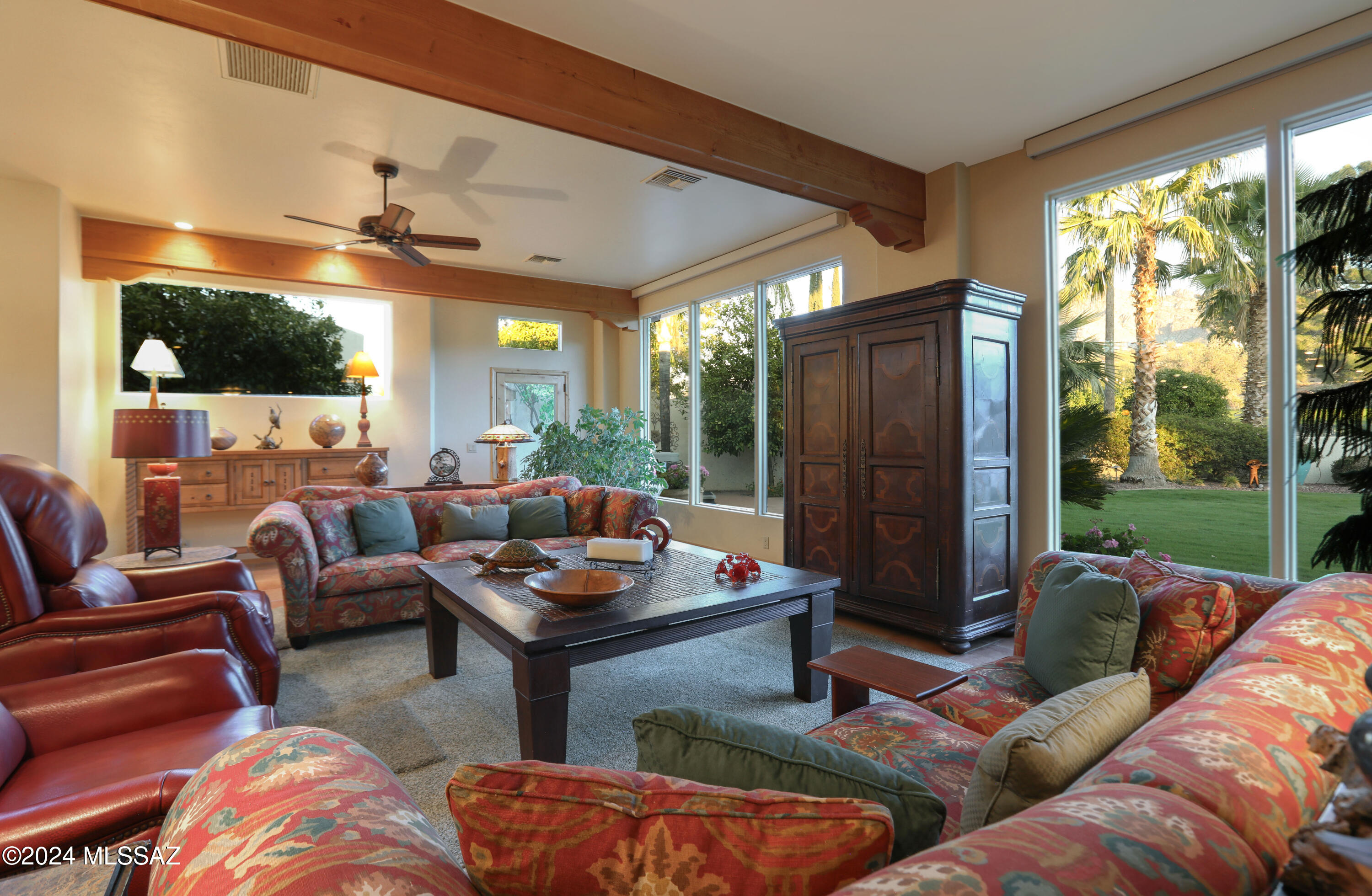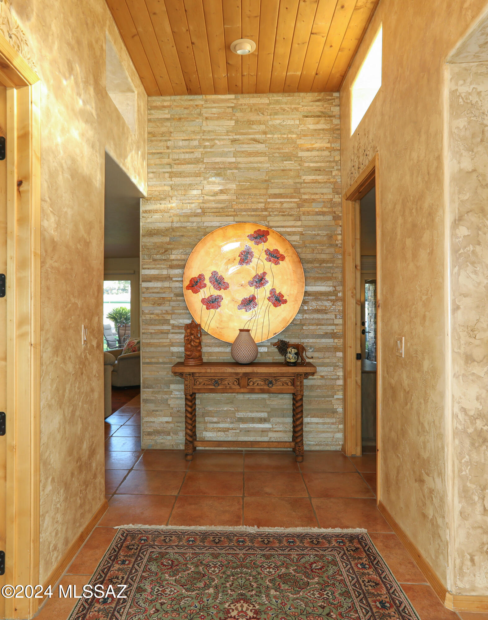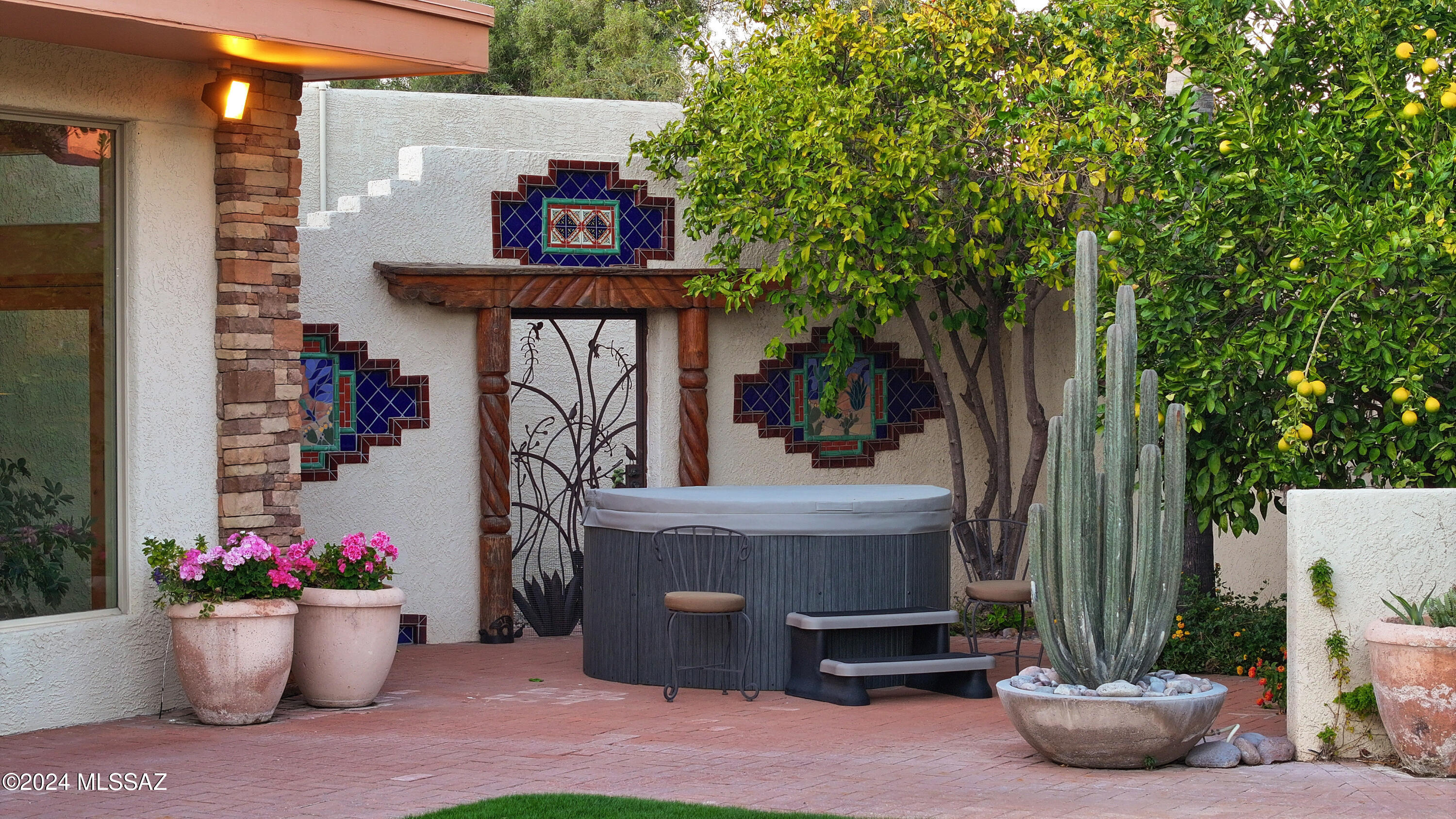 Nestled within the prestigious Oro Valley Country Club, this stunning 3-bedroom, 3.5-bath custom residence perfectly blends sophistication and comfort. Designed with the discerning homeowner in mind, the grand foyer adorned with striking ledger rock accents, sets the tone for the rest of the home. The spacious Great Room boasts a wood-beamed ceiling, a conversation area with gas fireplace, makes it the ideal space for entertaining guests in style. The Chef's dream kitchen features custom knotty alder cabinetry, granite countertops, a farm sink, and a suite of premium stainless-steel appliances including a warming drawer, expansive island and a coffee bar. The piece de resistance is the climate-controlled, 540 bottled wine room--a perfect spot to store your finest vintages. con't. Custom built-in desk and cabinets meets your home office needs. The versatile media/game room is a showstopper, featuring a wet walk-around bar, a 10-foot projection TV, and surround sound. Whether it's movie nights or lively gatherings, this space is sure to impress. Step outside to a beautifully landscaped backyard that adjoins the OVCC Hole #12 fairway. The outdoor kitchen equipped with gas grill, refrigerator, and sink makes al fresco dining a breeze. Unwind in the private hot tub while soaking in the captivating views of Pusch Ridge. The primary suite also includes a secluded patio with a fireplace, dual ceiling fans, and skylights for year-round enjoyment. Escape to the luxurious primary suite, complete with French doors that open to breathtaking backyard and Catalina Mountain views. Enjoy the retreat with gas fireplace, dual custom closets with organizers, and a spa-inspired bathroom with a jetted tub, split vanities, and intricate custom tile work. Each Guest bedroom offers unique comforts. One features a private ensuite with a porcelain copper vanity, while the other boasts a private patio and a nearby bathroom with a waterfall tile shower and glass vessel sink. A remodeled powder room with a sleek modern vessel. Additional amenities include an oversized 2-car garage with a mini-split system and separate garage door for golf cart area. A single car garage with workshop & sink. With 3 HVAC systems and 9 skylights, this home is as energy efficient as it is luxurious. This exquisite property combines luxury, convenience, and thoughtful design, creating the ultimate living experience.